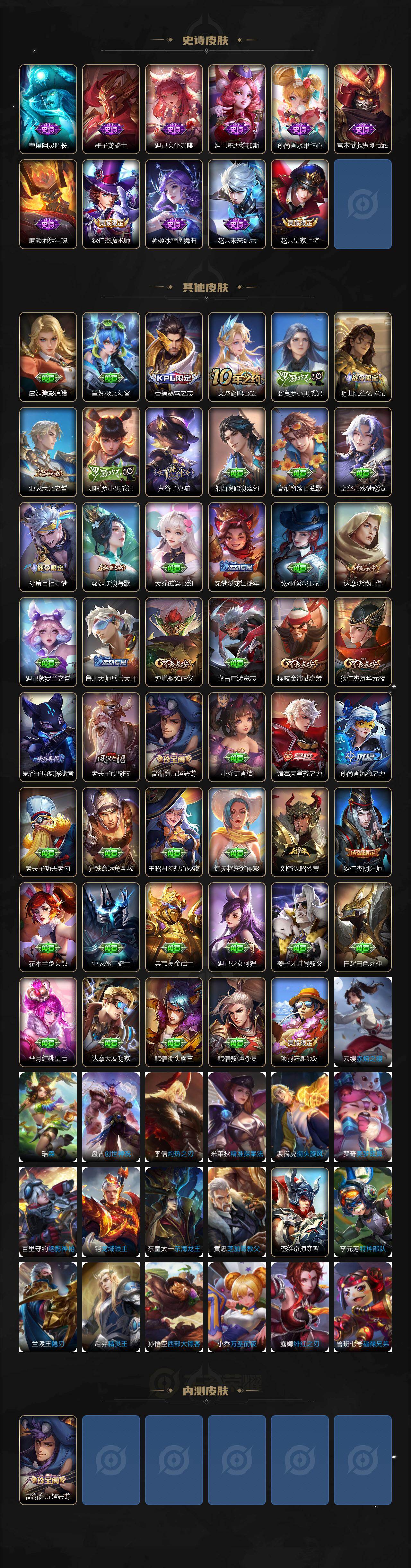 【传说皮肤】:大司命死亡执政官,司马懿九山相柳,典韦战鼓燎原,澜逐花归海,马可波罗深海之息,马超无双飞将,赵云淬星耀世,铠绛天战甲,镜炽阳神光,张良黄金