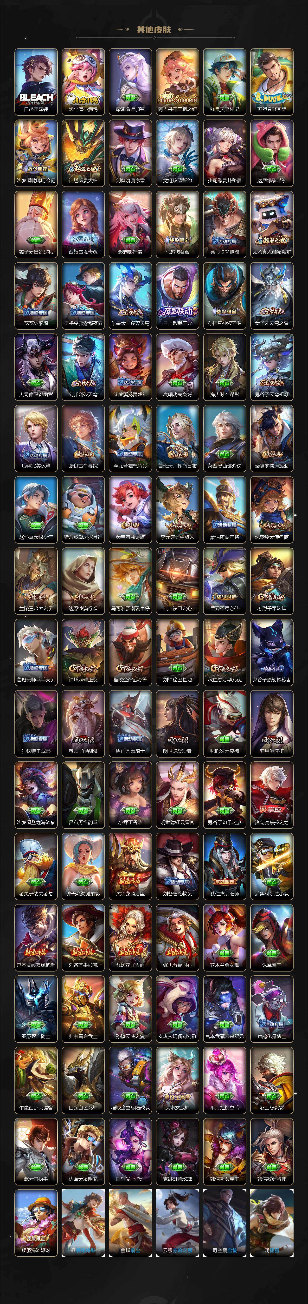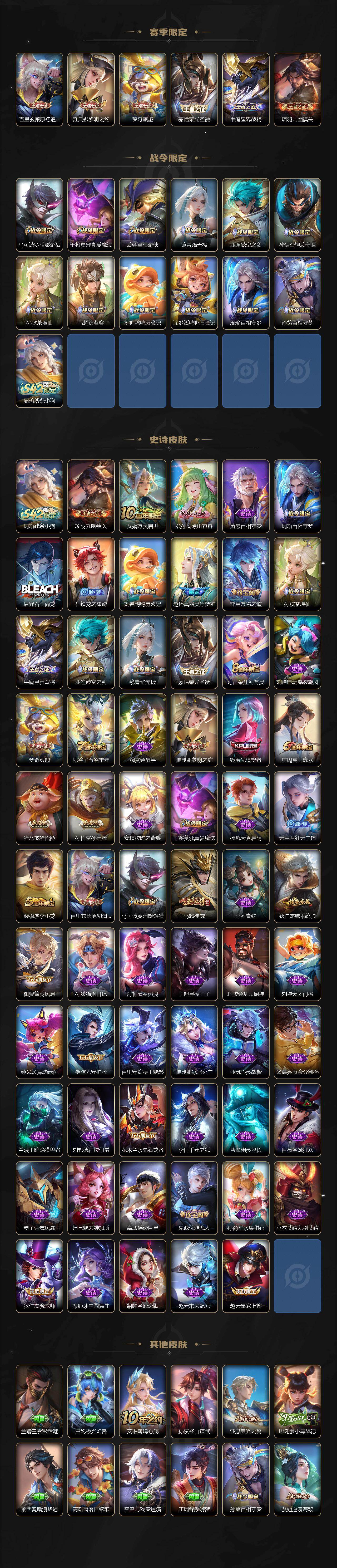 【限定皮肤】:姜子牙天穹之誓,狄仁杰阴阳师,赵云皇家上将,嬴政优雅恋人,庄周高山流水,马可波罗暗影游猎,狄仁杰魔术师,狄仁杰万华元夜,达摩沙漠行僧,项羽海滩派对,老夫子醍醐杖,程咬金演武夺筹,兰