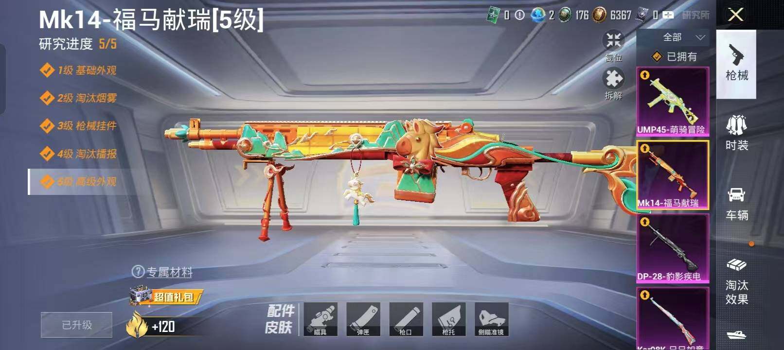 【粉色枪皮等级】:UMP45-萌骑冒险(五级),Kar98K-巳巳如意(五级),Mk14-福马献瑞(五级),DP-28-豹影疾电(五级)