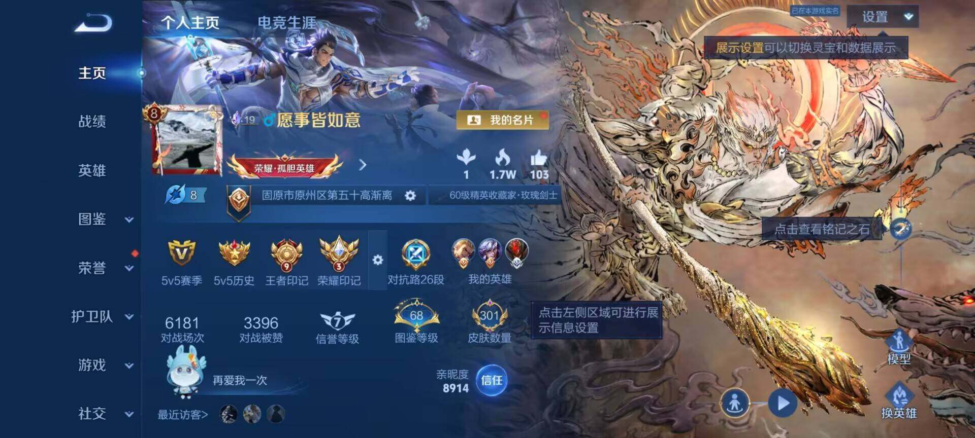 【16776770】贵族8/皮肤301/典藏1/传说19/史诗90/英雄129