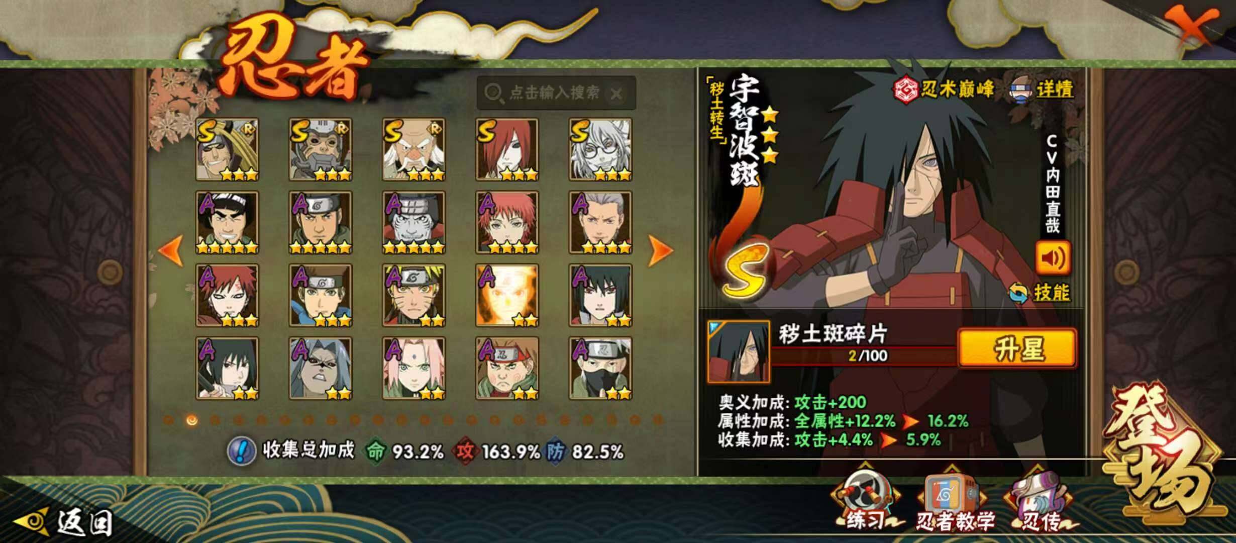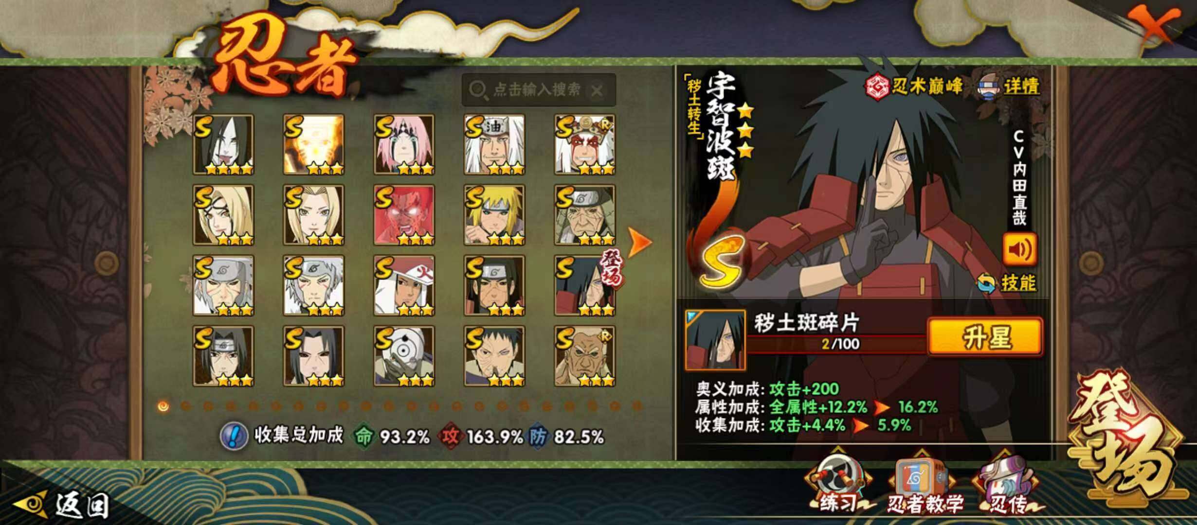 25S级忍者数-39A级忍者数【S级忍者】:长门「秽土转生」(3星),半藏「秽土转生」(3星),金角·银角「秽土转生」(3星),猿飞日斩「秽土转生」(3星),波风水门「秽土转生」(3星),千手扉间「秽土转生」(3星),千手柱间「秽土转生」(3星),宇智波鼬「秽土转生」(3星),宇智波斑「秽土转生」(3星),大野木「忍界大战」(3星),春野樱「忍界大战」(3星),宇智波带土「忍界大战」(3星),宇