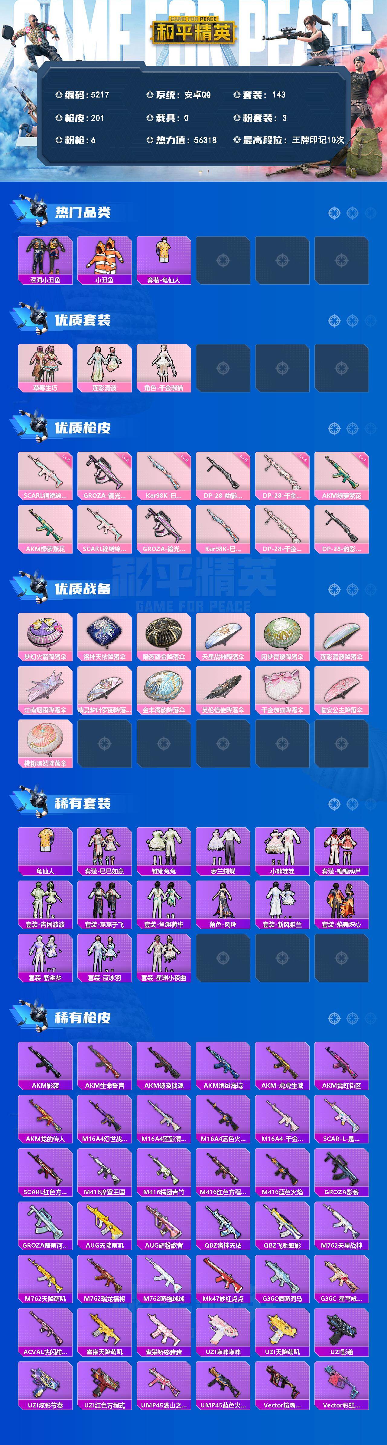 安卓 手Q-3粉装-6特效枪-0载具-0粉色飞行器-56318热力值-10王牌印记-143套装-201枪皮