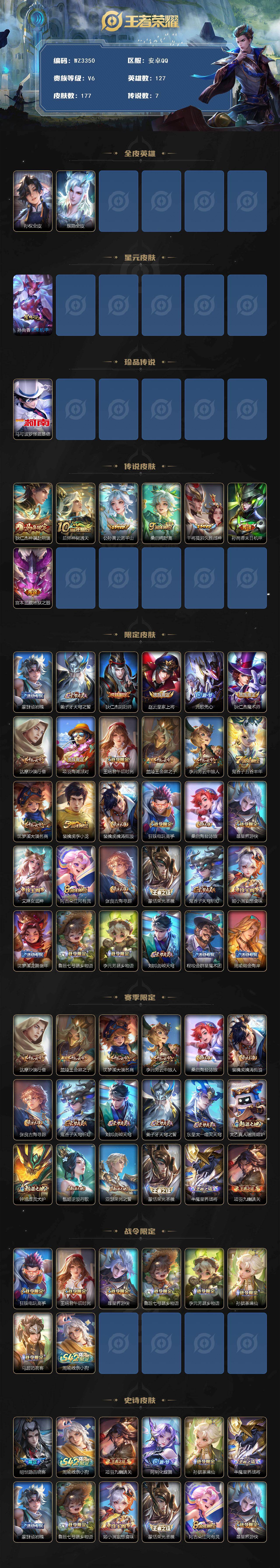 【秒换绑】安卓Q-V6-最强王者段位-127英雄-177皮肤-1珍品传说-7传说-41史诗