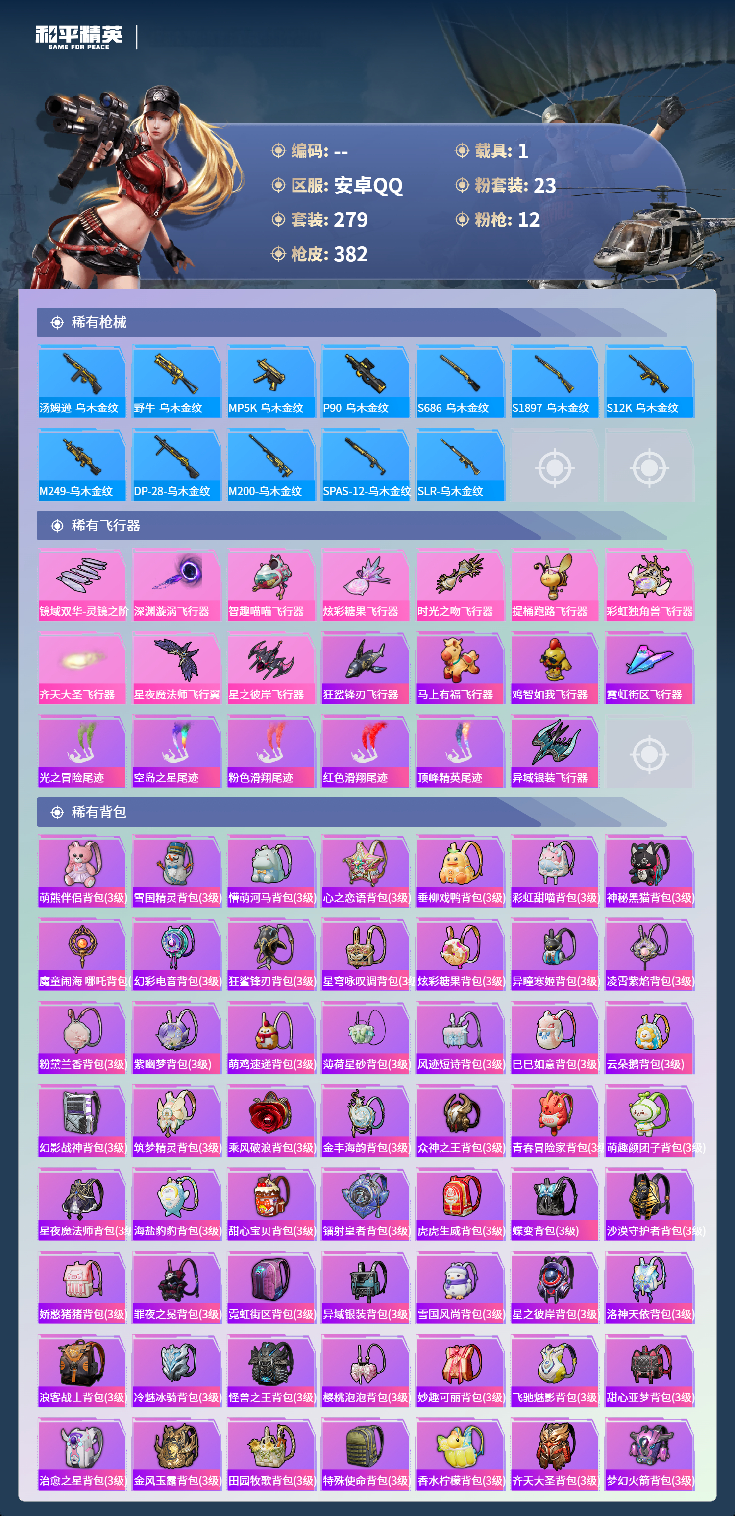 安卓手Q-22王牌印记-有战神框-23粉装-12特效枪-1载具-热