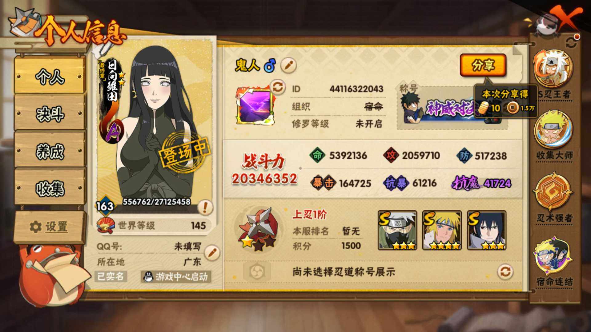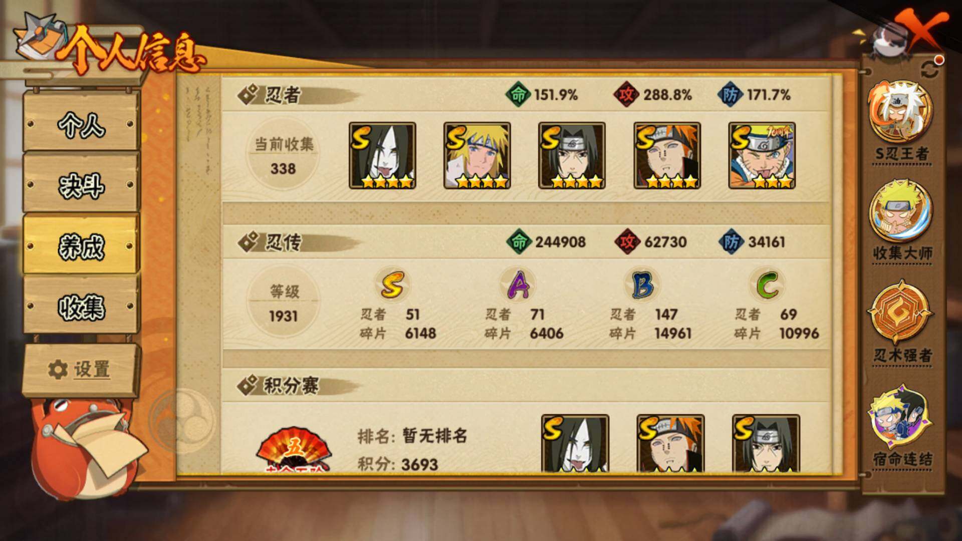 V12 51S 71A 2034万战力 4.3万金币 仙人自来也59片 烈斗9