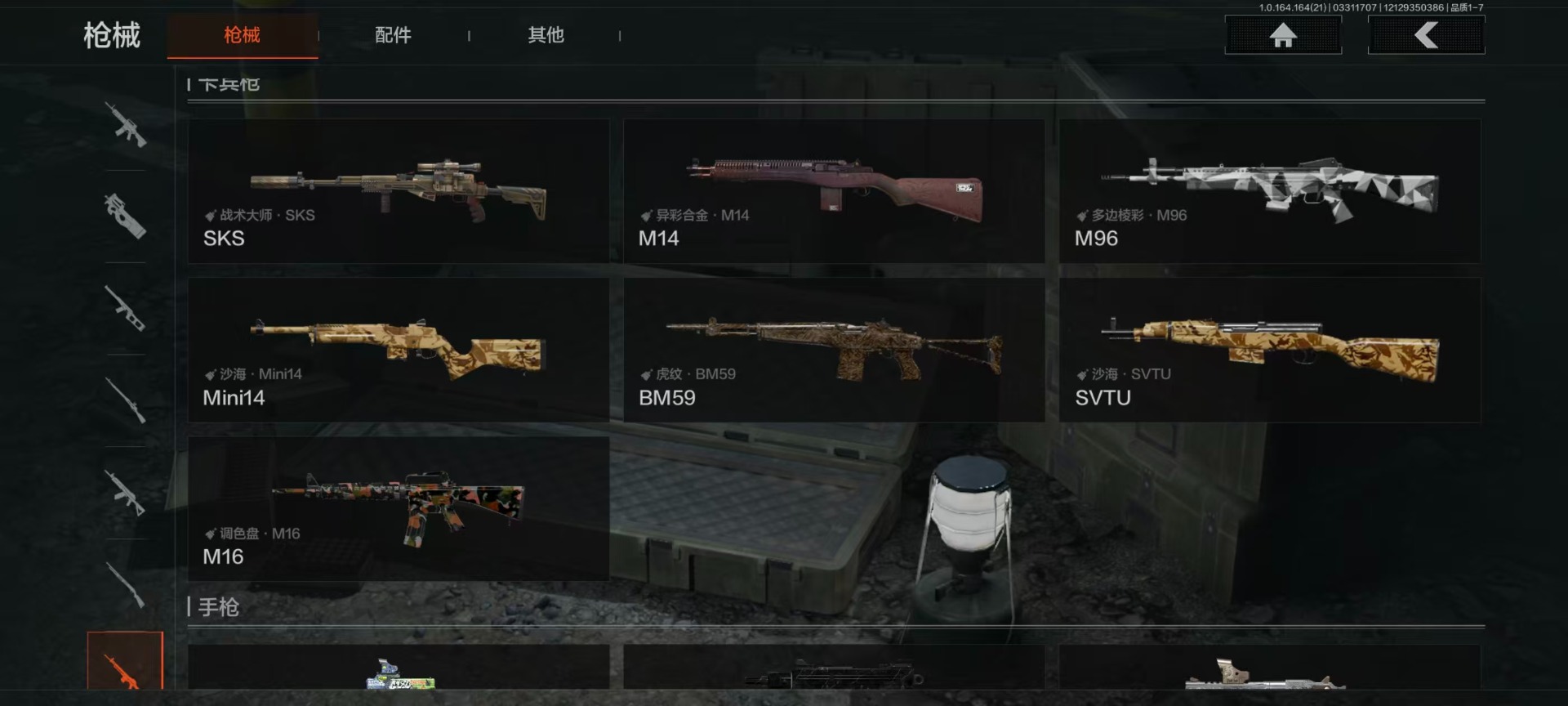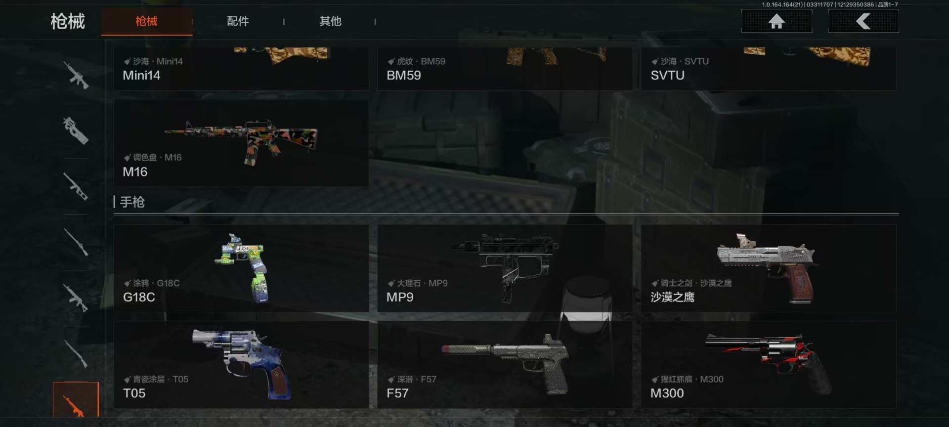 【金色枪皮】地脉深处·ACE31,近卫荣誉·RPK16,包络战术·AKM,战术大师·AN94,战术大师·AEK,千炼铁阵·MK14,黑金弹头·P90,竞技风潮·M4A1,旧王圣谕·QBZ191,利齿