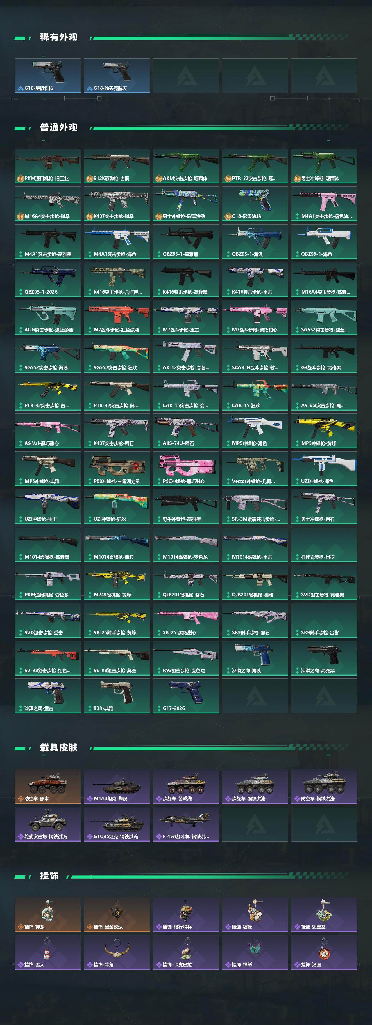 【传说外观】:M4A1突击步枪-蚀金玫瑰,AKM突击步枪-锦绣,SG552突击步枪-运动员,SG552突击步枪-点翠,K437突击步枪-锦绣,KC17突击步枪-点翠,SMG-45冲锋枪-锦绣,QCQ171冲锋枪-不羁人生,M14射手步枪-蛮荒,M14射手步枪-缄花,SKS射手步枪-骑士,SR-25射手步枪-缄花,PS
