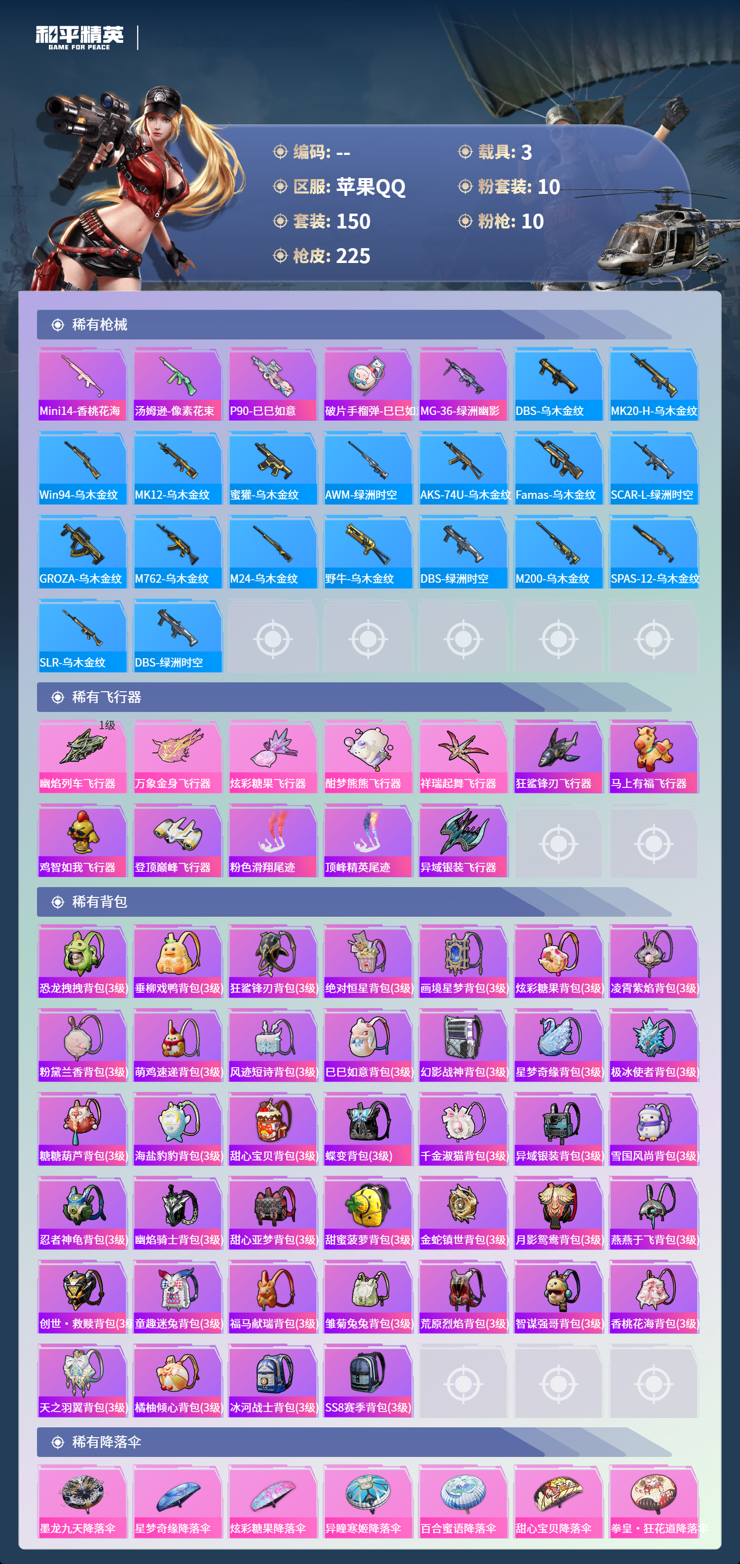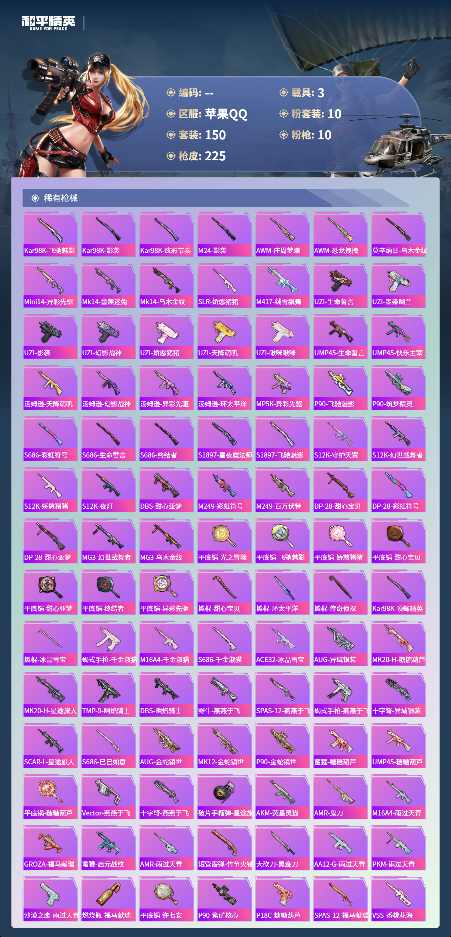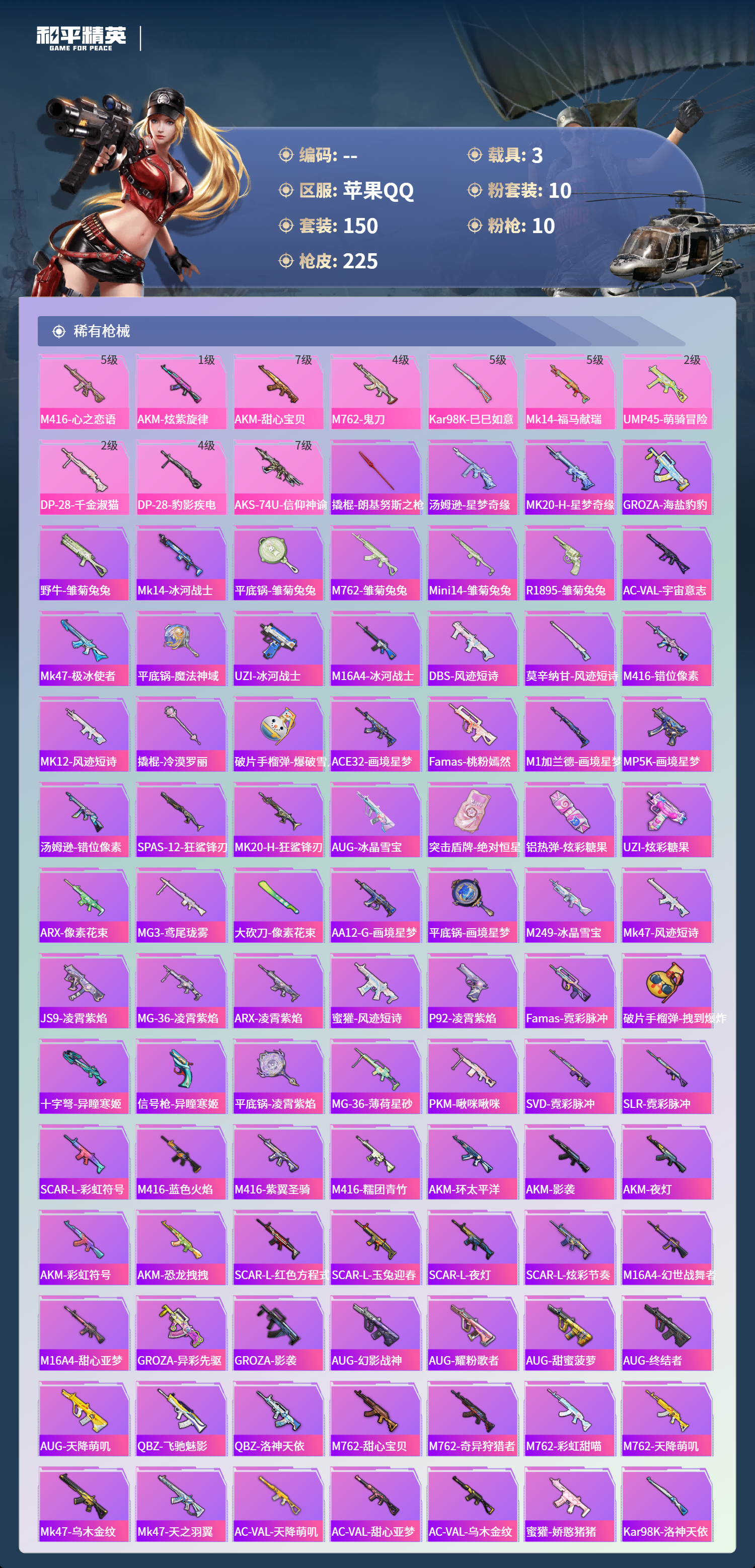 苹果手Q-13王牌印记-1红装-10粉装-10特效枪-3载具-73