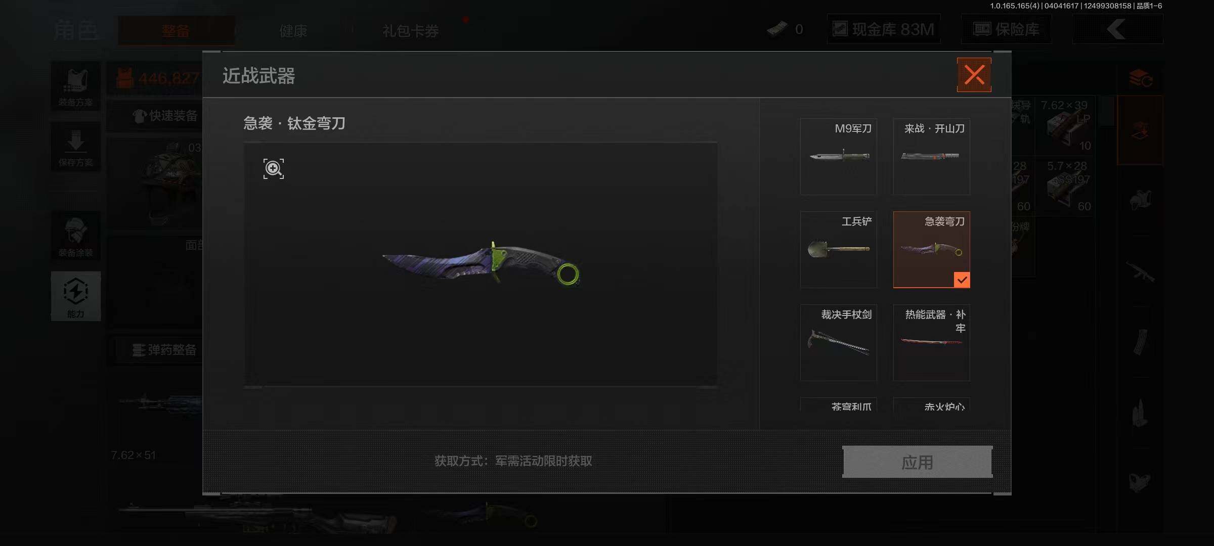 等级:30/段位:大师/仓库价值(百万):86/柯恩币:83449716/裁决手杖剑/急袭弯刀/