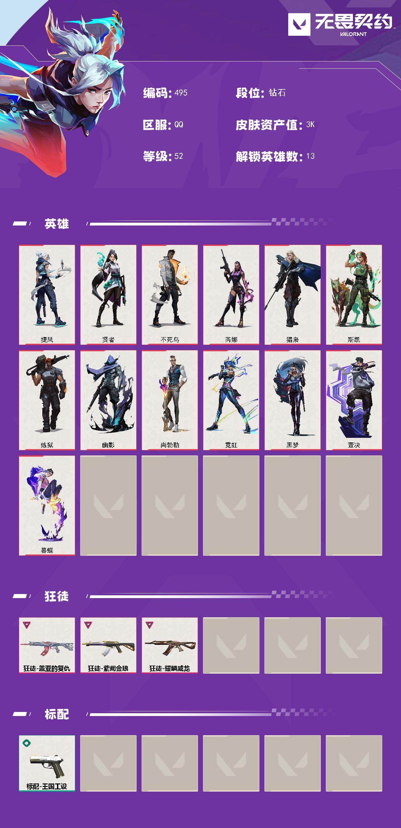 【495】【英雄】:捷风,贤者,不死鸟,芮娜,猎枭,斯凯,炼狱,幽影,尚勃勒,