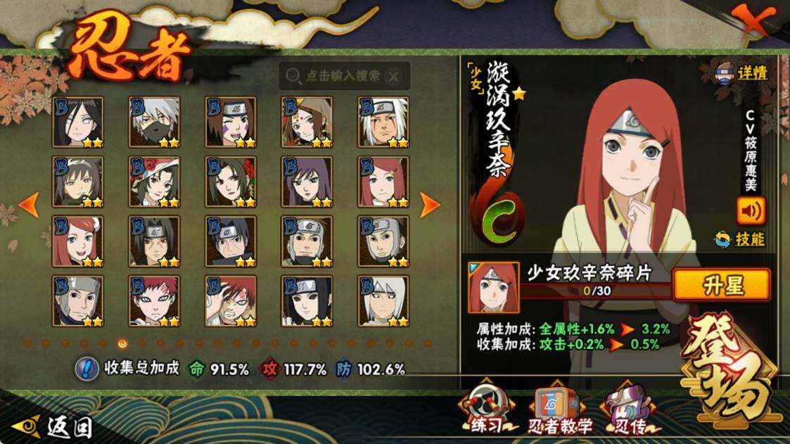 【S级忍者】:宇智波斑「秽土转生·解」(3星),春野樱「忍界大战」(3星),宇智波带土「忍界大战」(3星),艾「忍界大战」(3星),宇智波鼬「须佐能乎」(3星),千手柱间「木叶创立」(3星),自来也(3星),自来也「舞之豪杰」(3星),大蛇丸(3星),纲手(3星),波风水门(3星),神秘面具男「红夜之刃」(3星),漩涡鸣人「九喇嘛连结」(3星),迈特凯