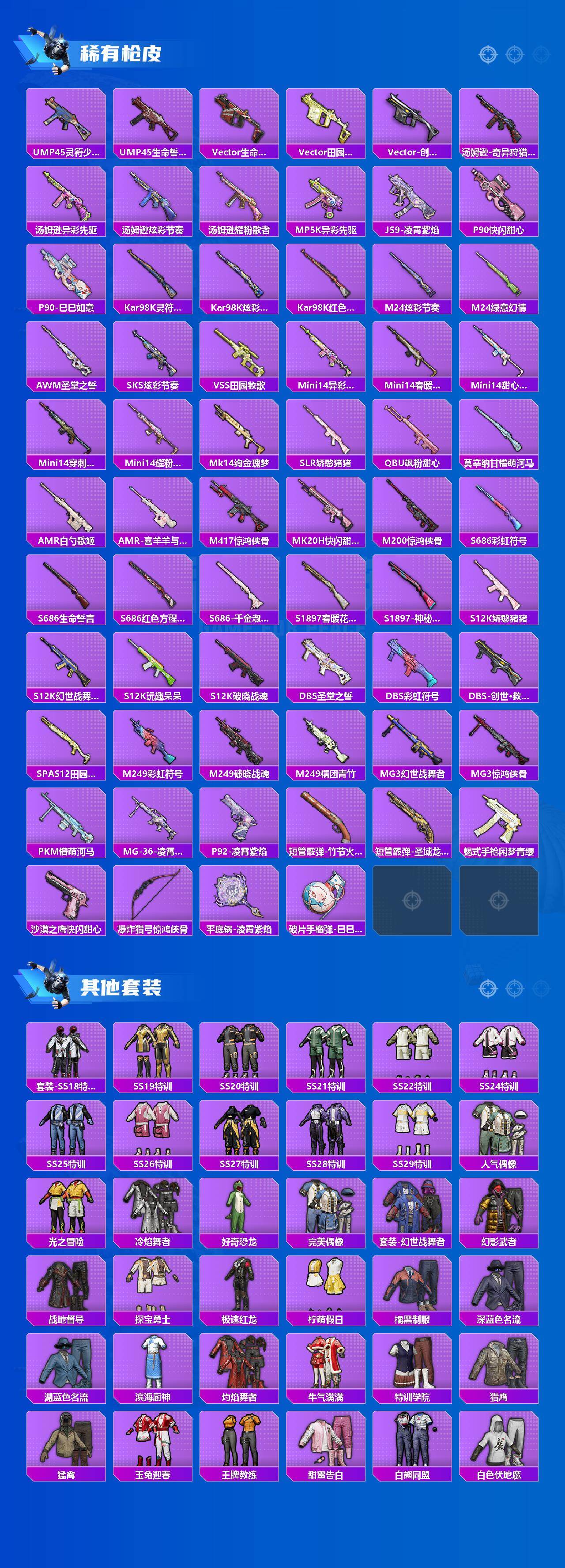 【粉色枪皮等级】:AKM-绿萝繁花(五级),SCAR-L-锦绣绵绵(五级),GROZA-镜光银凌(五级),AUG-暖羊咩咩(五级),Kar98K-创世·救赎(五级),Kar98K-巳巳如意(五级),DP-28-豹影疾电(五级)