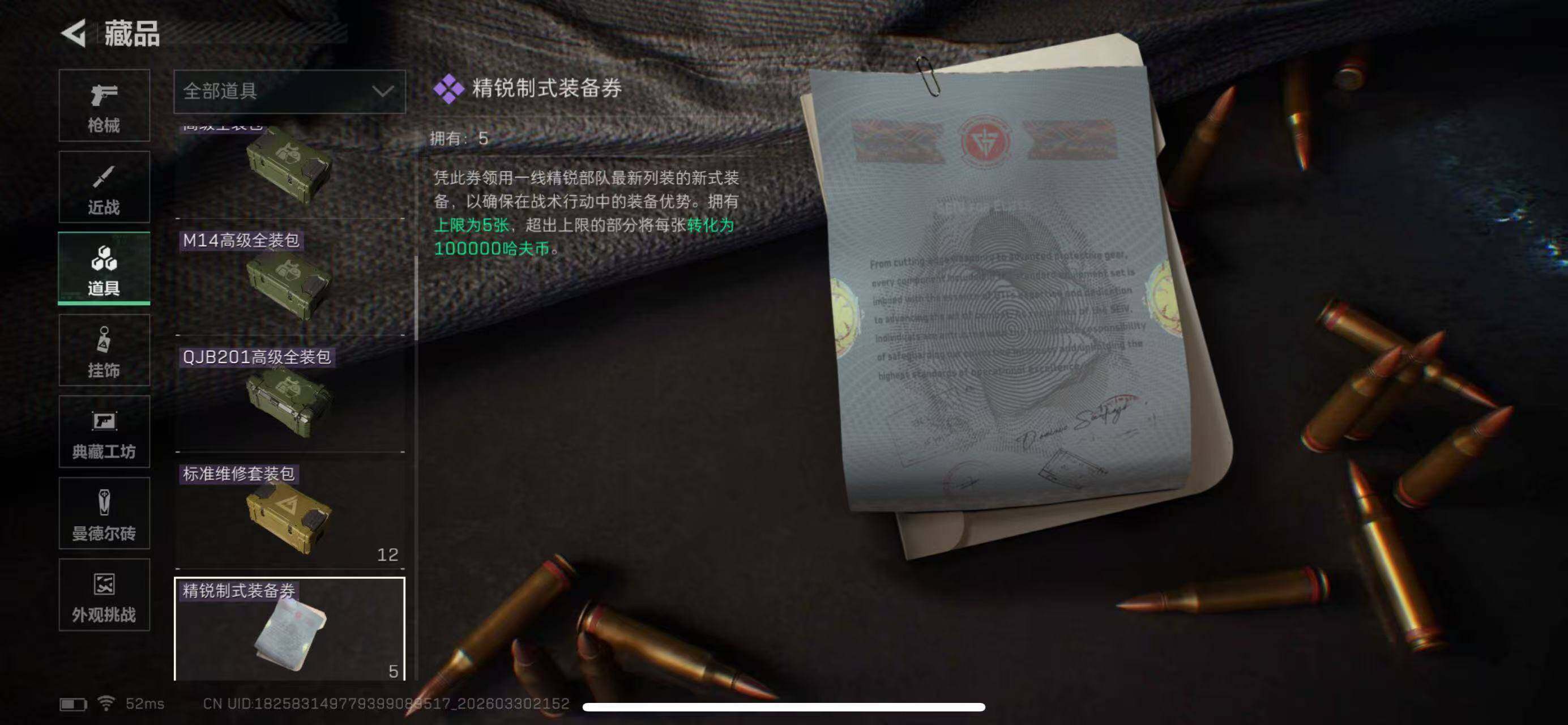 行动等级:60 总资产:197M 哈夫币:4287K 近战武器