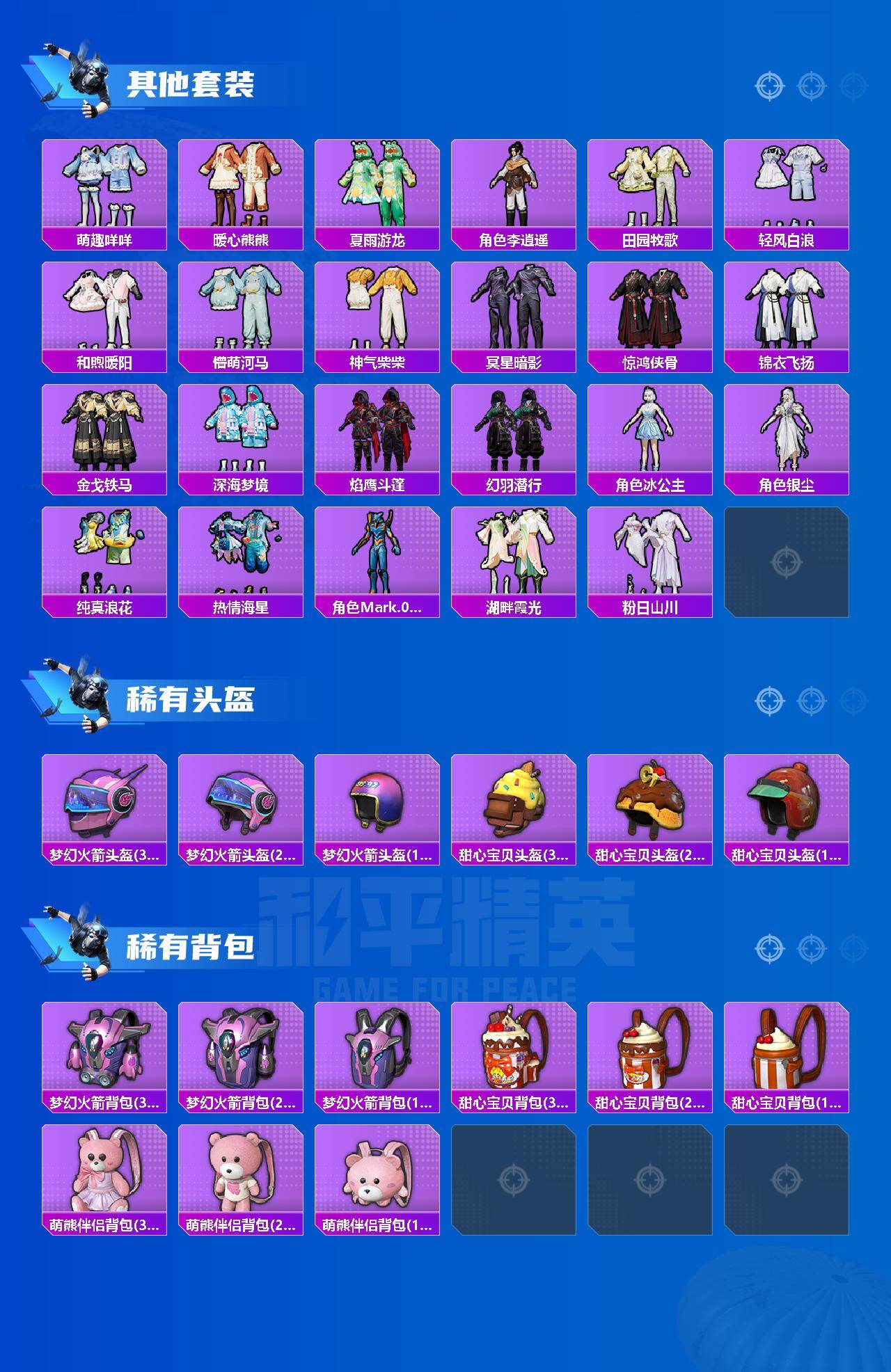 【热门品类】:粉装-梦幻火箭,套装-浪漫天命,套装-派对舞王,套装-奇异狩猎者,套装-暗影哥特,套装-粉红小猪,套装-摄影小熊猫,套装-红红火火,角色-Mark.06