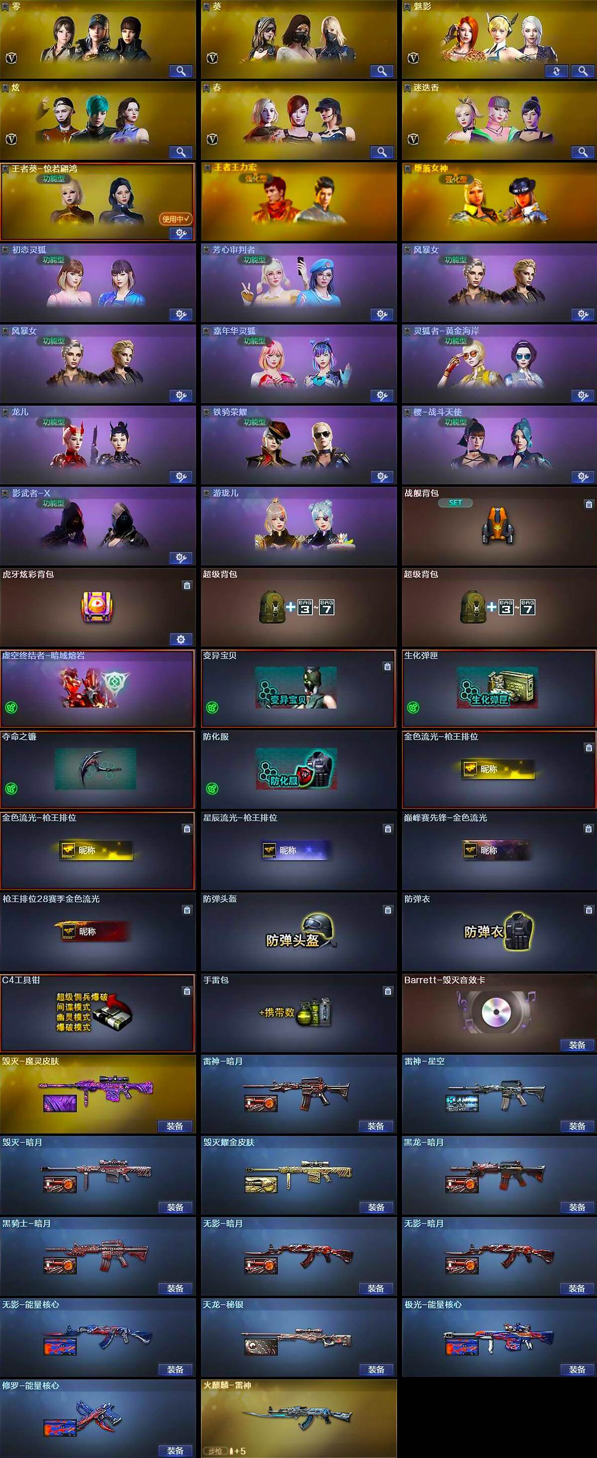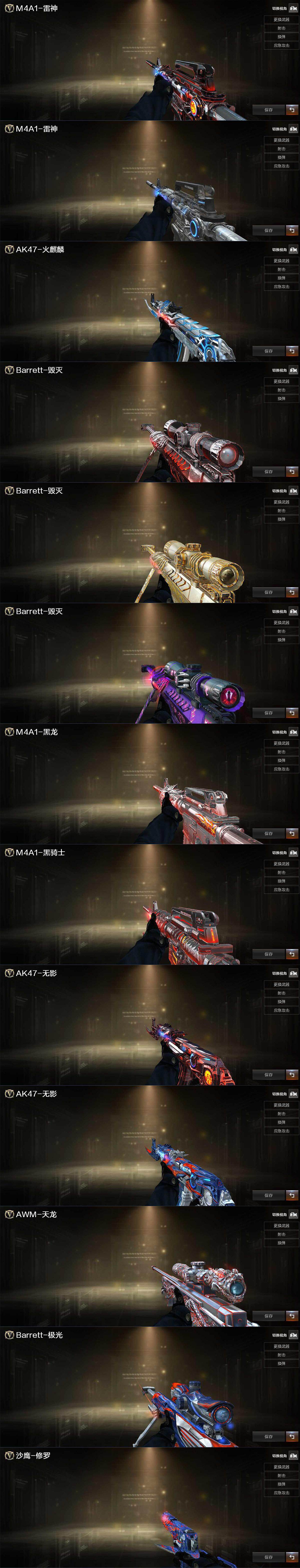 【热门武器】:QBZ03-金色蔷薇*2,Scar Light-白虎,死亡之眼,炼狱-迷你小钢,M4A1-黑骑士,汤姆逊-烈龙*6,RPK-盘龙*6,加特林-炼狱*2,斯泰尔-蝴蝶,USP-雷暴,COP-堕天神,沙鹰-修罗*6