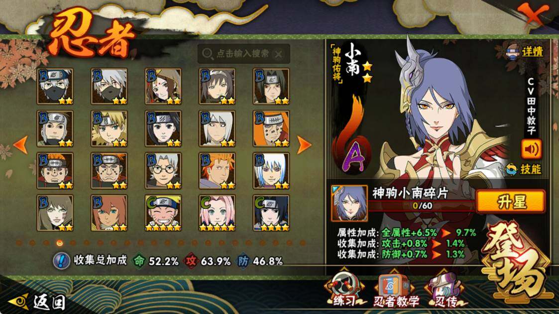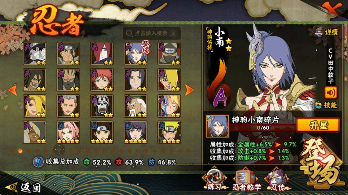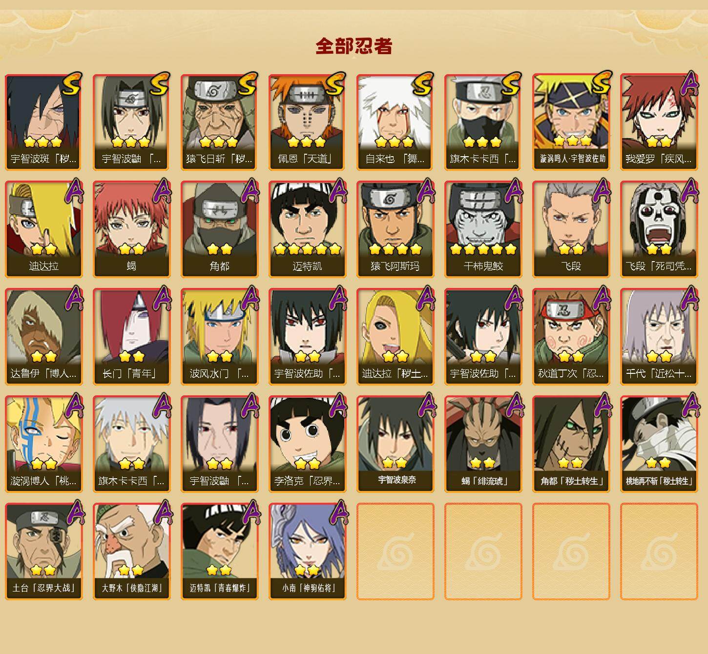 【S级忍者】:猿飞日斩「秽土转生」(3星),宇智波斑「秽土转生·解」(3星),宇智波鼬「须佐能乎」(3星),旗木卡卡西「须佐能乎」(3星),自来也「舞之豪杰」(3星),佩恩「天道」(3星),漩涡鸣人·宇智波佐助(3星)