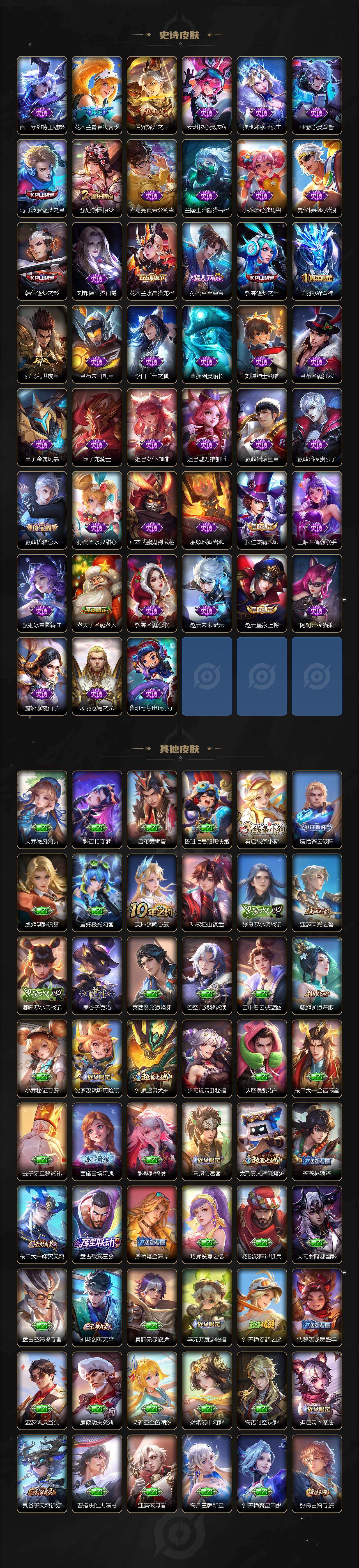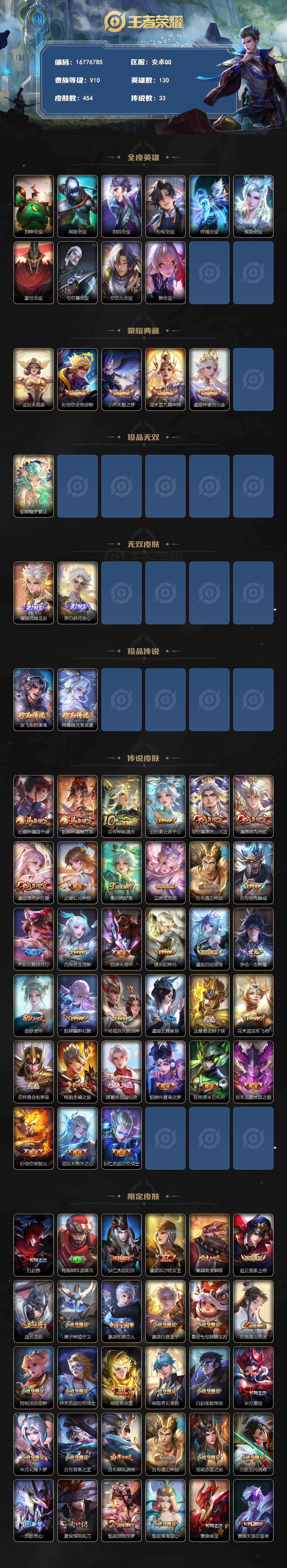 【16776785】贵族10/皮肤454/典藏4/传说33/史诗138/英雄1