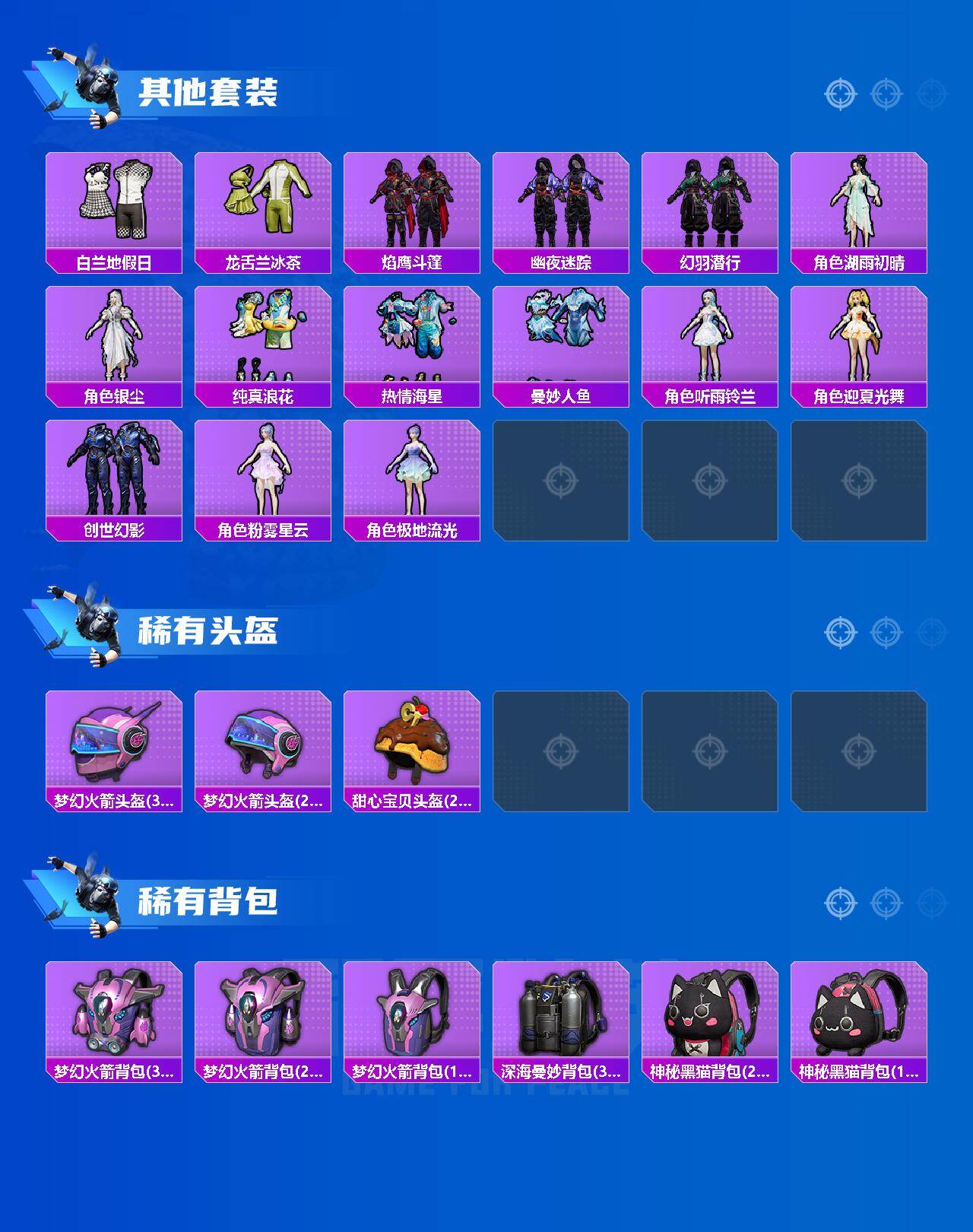 【粉色套装】:粉装-宝贝奶油派,粉装-梦幻火箭,粉装-橘柚倾心,角色-小蓝,套装-创世·救赎,角色-樱桃泡泡,角色-凤凰座 一辉