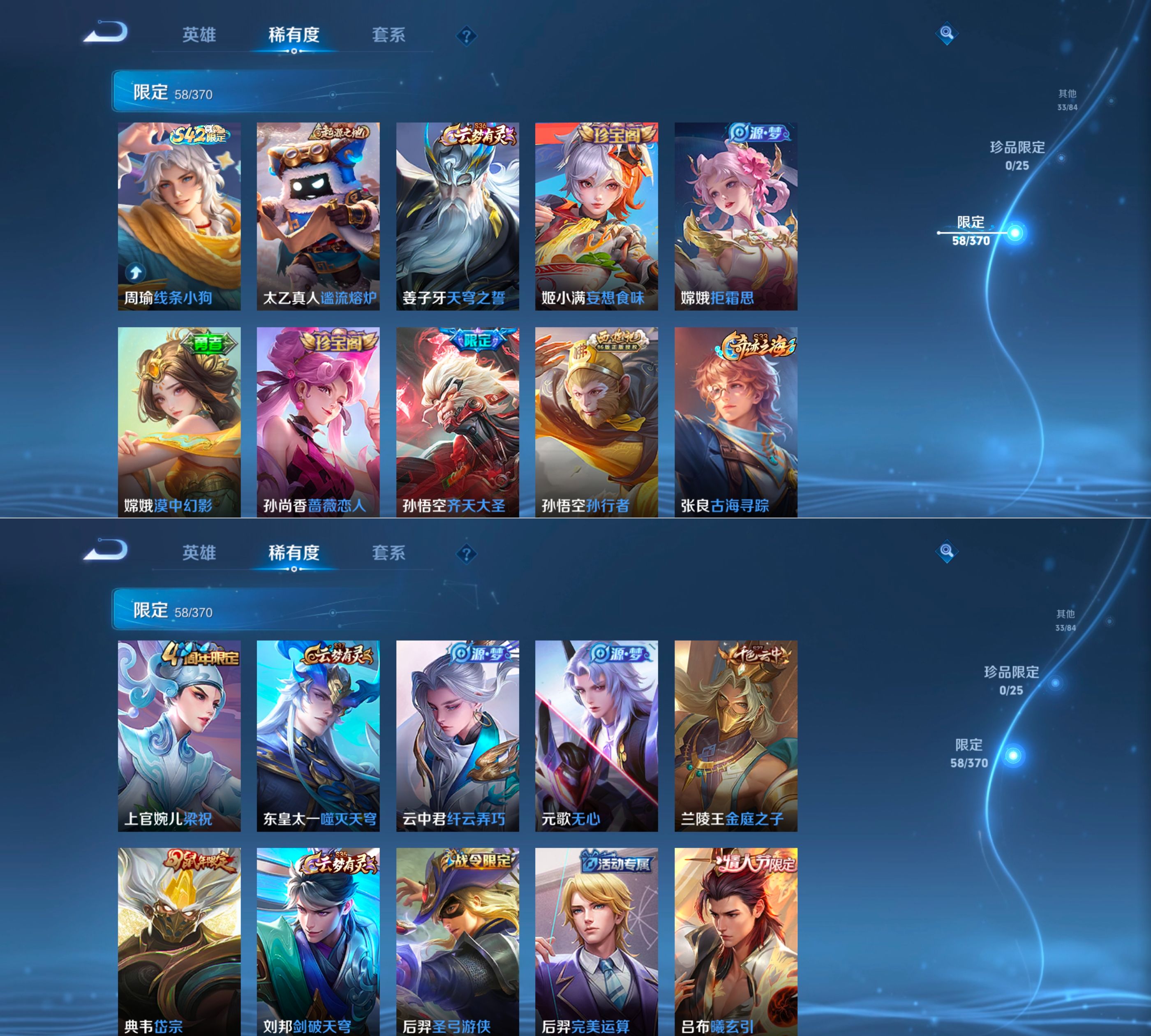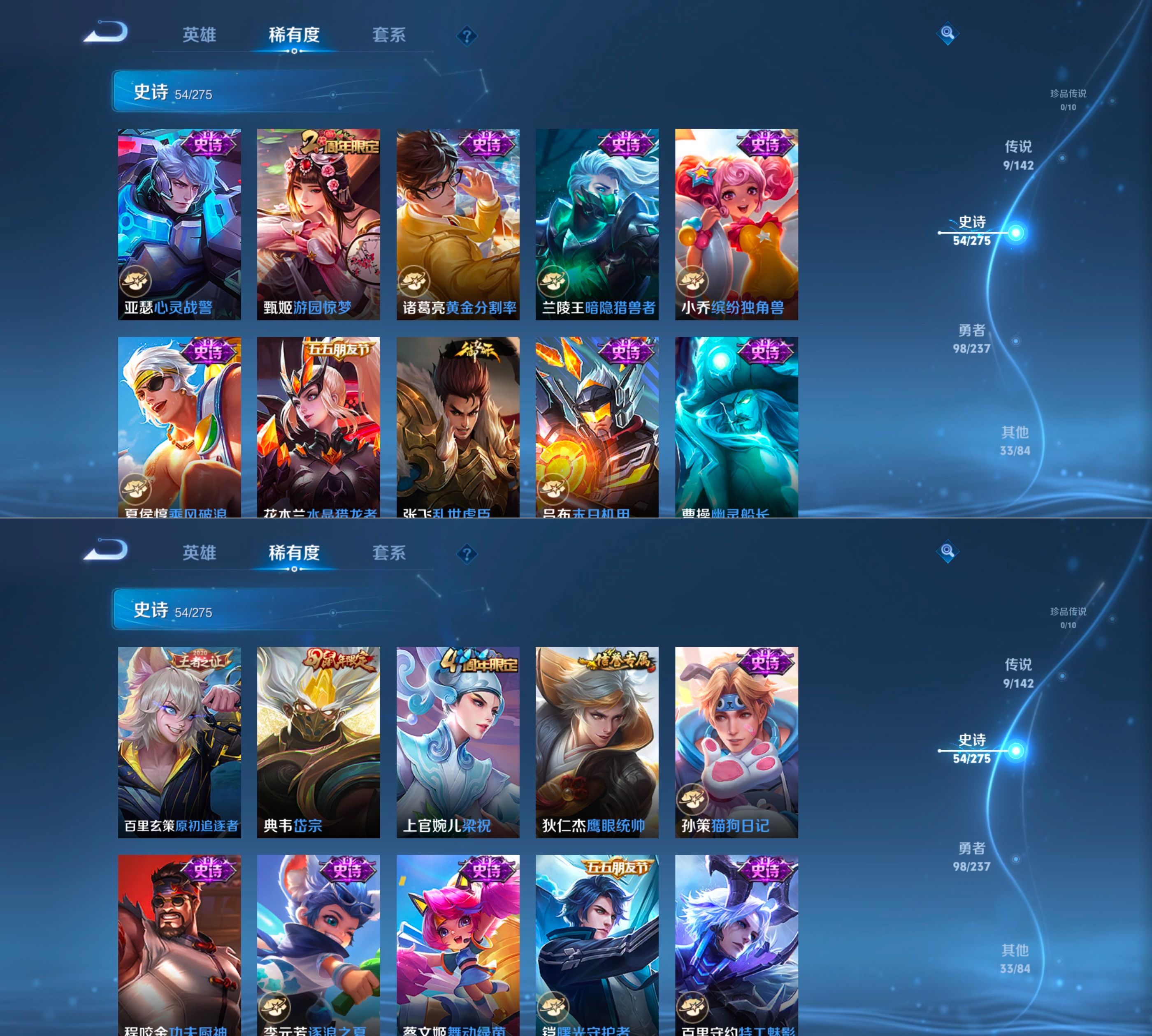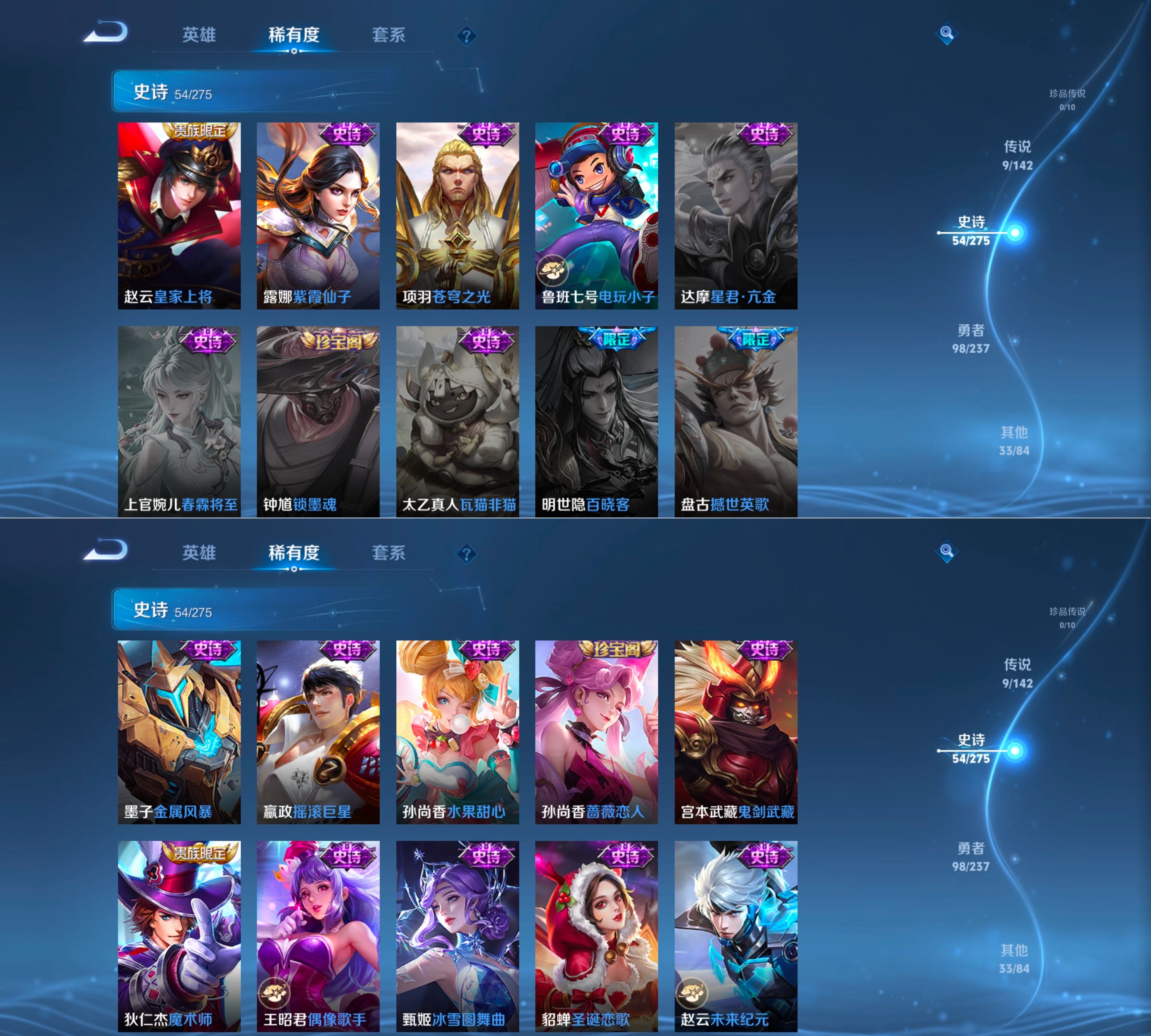 【史诗皮肤】 蔬乡物语 百解令 蔬乡物语 荣光圣徽 星界战将 岱宗 玫瑰异探 电玩小子 孙行者 山海·玄木吟 江河有灵 完美运算 谧流熔炉 漠中幻影 线条小狗 舞动绿茵 幽灵船长 拒霜思 功夫厨神 魔术师 鹰眼统帅 圣诞恋歌 鬼剑武藏 水晶猎龙者 火炮绅士 曙光守护者 暗隐猎兽者 逐浪之夏 紫霞仙子 末日机甲