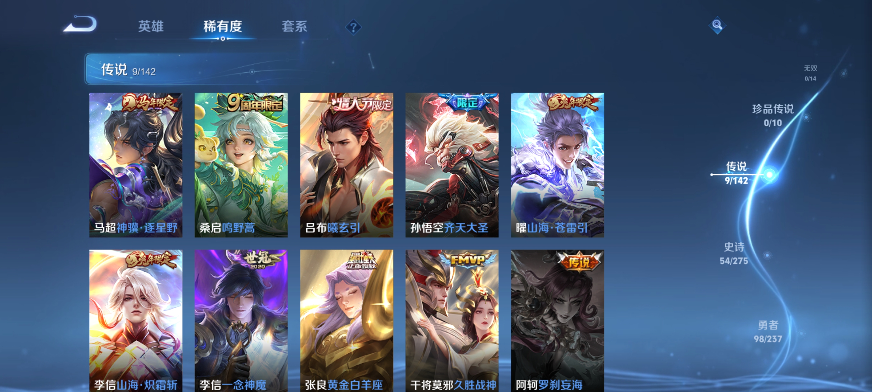 【传说皮肤】 鸣野蒿 神骥·逐星野 曦玄引 山海·苍雷引 齐天大圣 山海·炽霜斩 久胜战神 一念神魔 黄金白羊座
