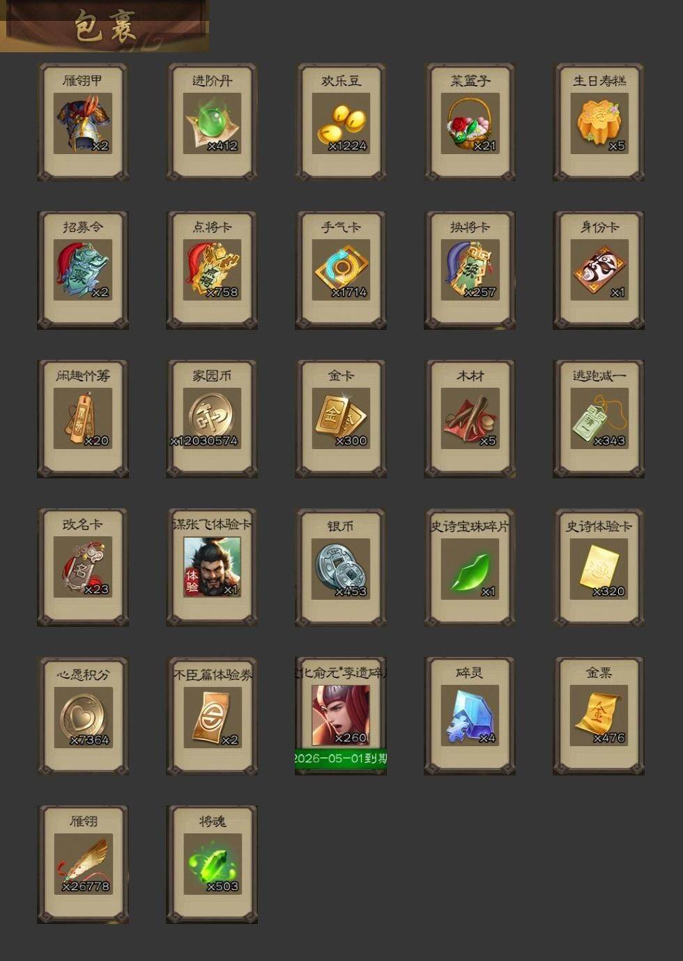 官阶:大将军;VIP等级:VIP11;史诗武将数量:62;动态皮肤数量:54;武将总数:405;史诗宝珠数量:0;将魂数量:503;神将:8;魏国史诗武将:31;蜀国史诗武将:10;吴国史诗武将:11;群史诗武将:22