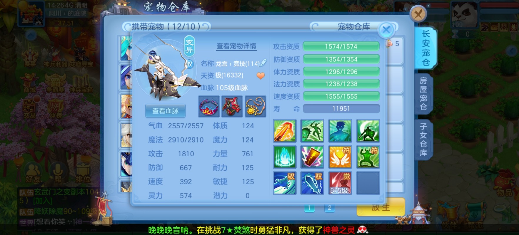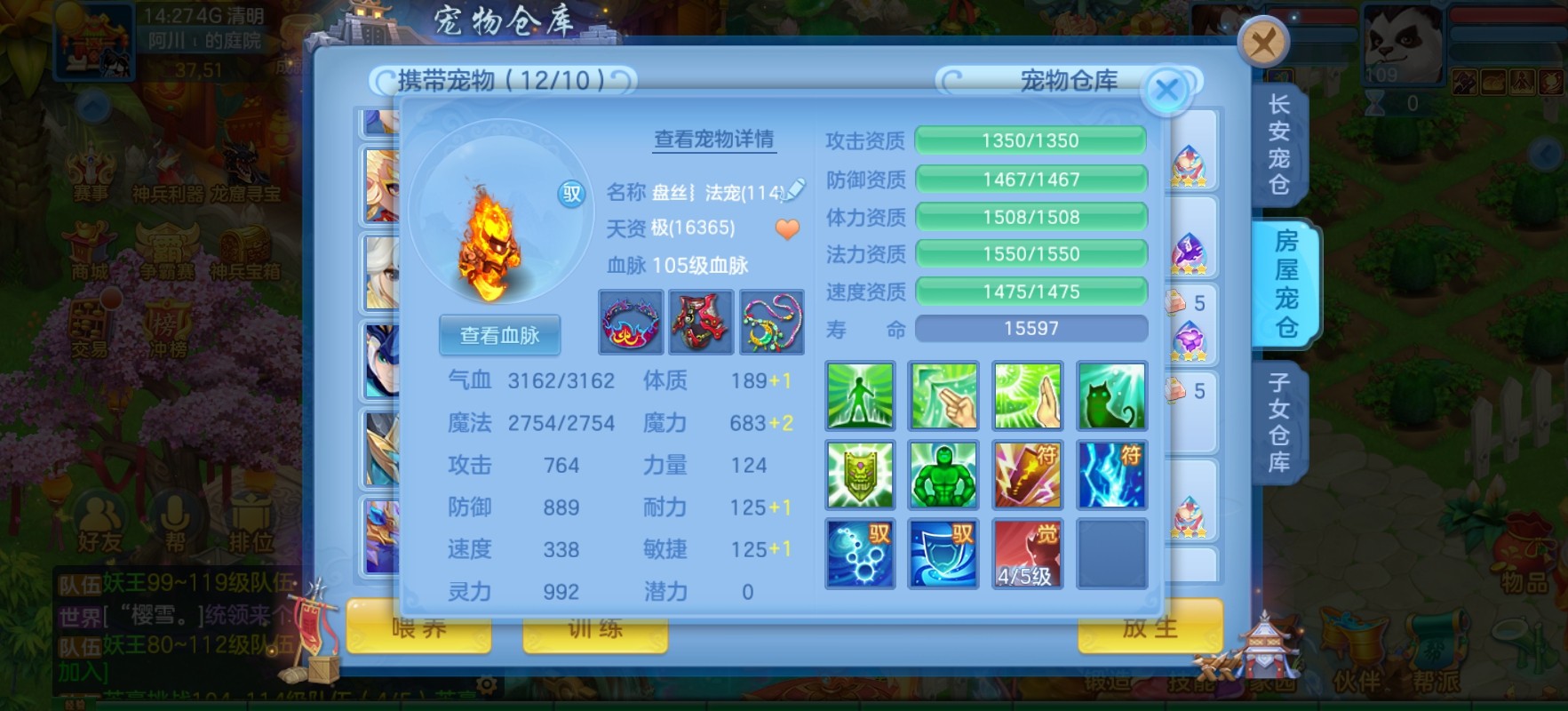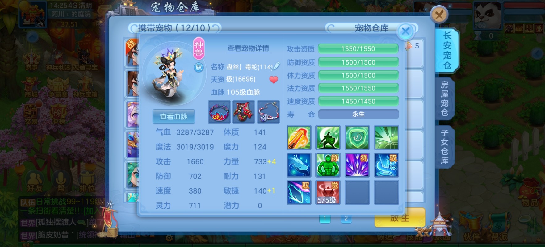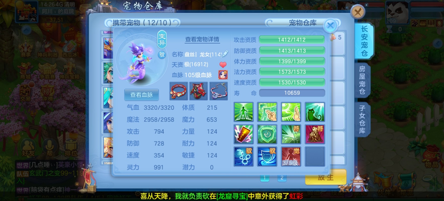 109满段盘丝,旁边带13混12宝石龙宫,盘丝可飞身129,满官职,修炼能满,宝宝齐全