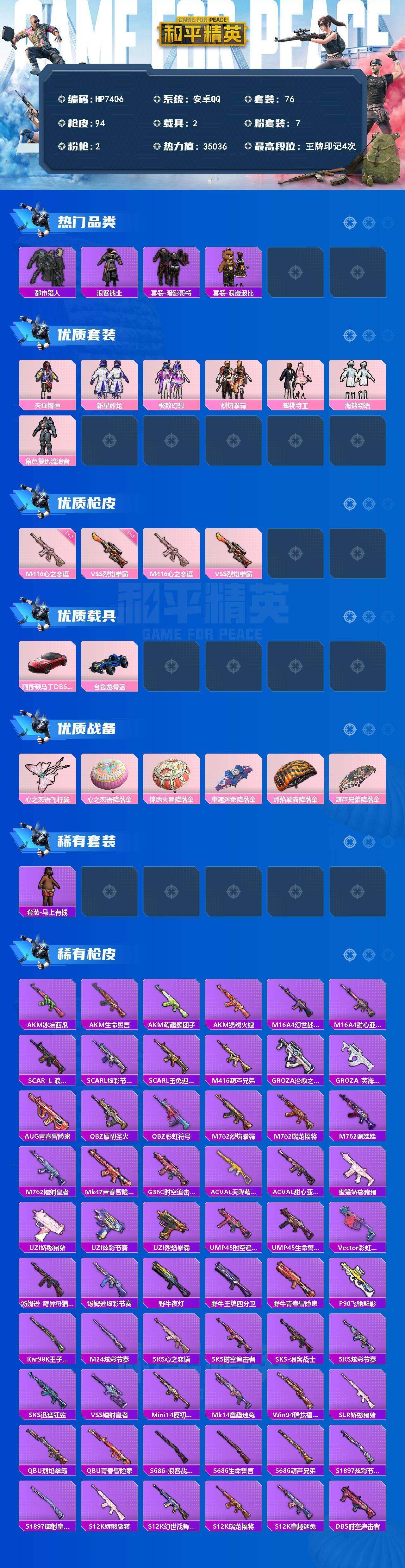 (7粉套2粉枪2载具)都市猎人/浪客战士/暗影哥特/浪漫波比/天禅智恒/新星烈龙/极致幻想/烈焰拳霸/蜜桃特工/海盐物语/复仇流浪者/M416心之恋语七级/VSS烈焰拳霸五级/阿斯顿马丁红/合金龙骨蓝/没战神框/HP7406-1粉色飞行器-35036热力值-4王牌印记-76套装-94枪皮
