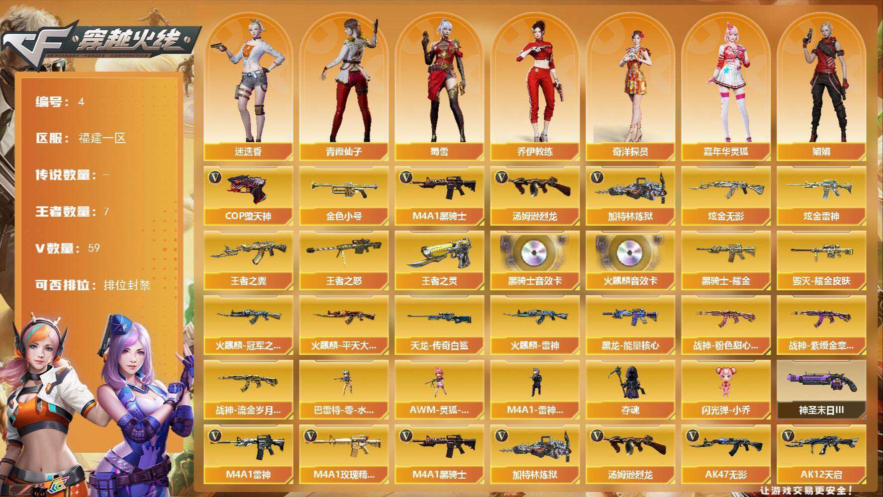 XXCF102【58V 王者7 炫金3】【等级】100【区服】福建一区【VIP】1【段位】传奇3【英雄角色】1【英雄武器】58【王者级武器】王者之翼 王者之怒 王者之怒-觉醒版 王者之灵 王者之灵 王者之啸-觉醒版