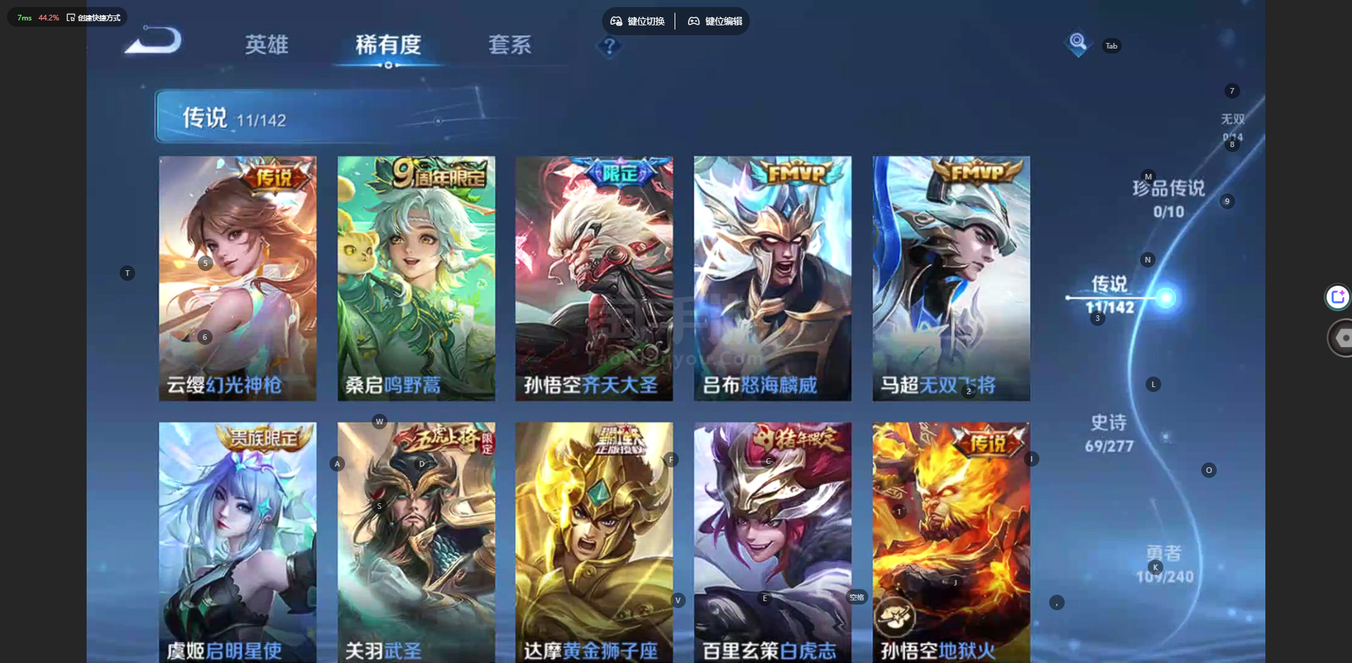 苹果Q-v8-269皮-2典藏-11传说-1星传说-6552星币-怒海凌威/无双飞将/武圣关羽/白虎志/李小龙/至尊宝
