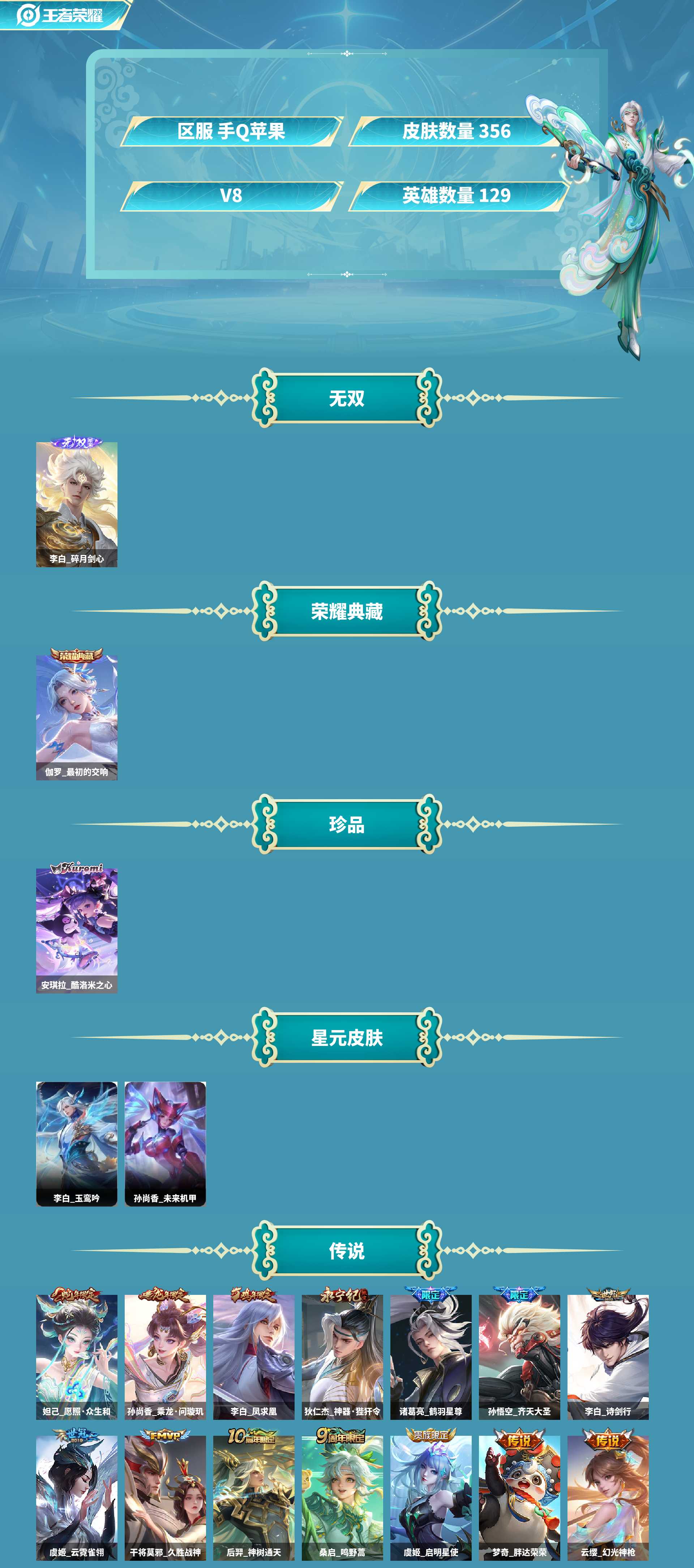 李白无双+玉鸾吟!伽罗典藏+一颗未用水晶!库洛米!皮肤数量3