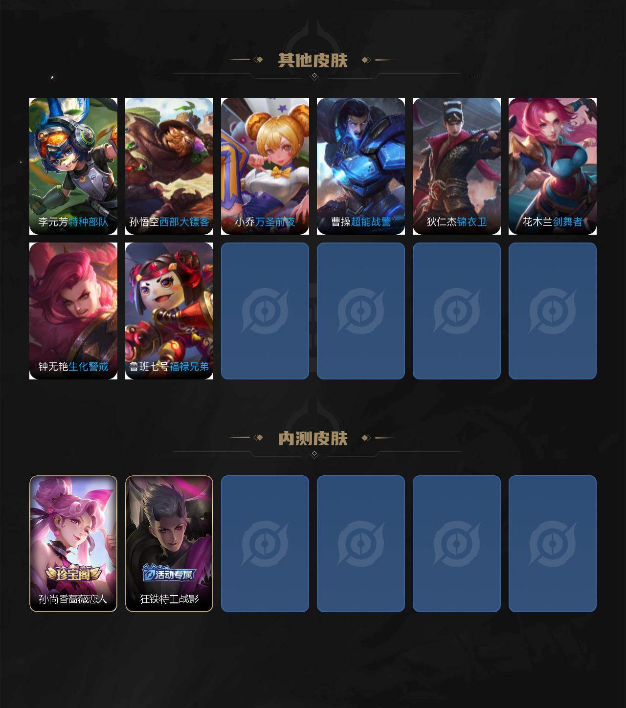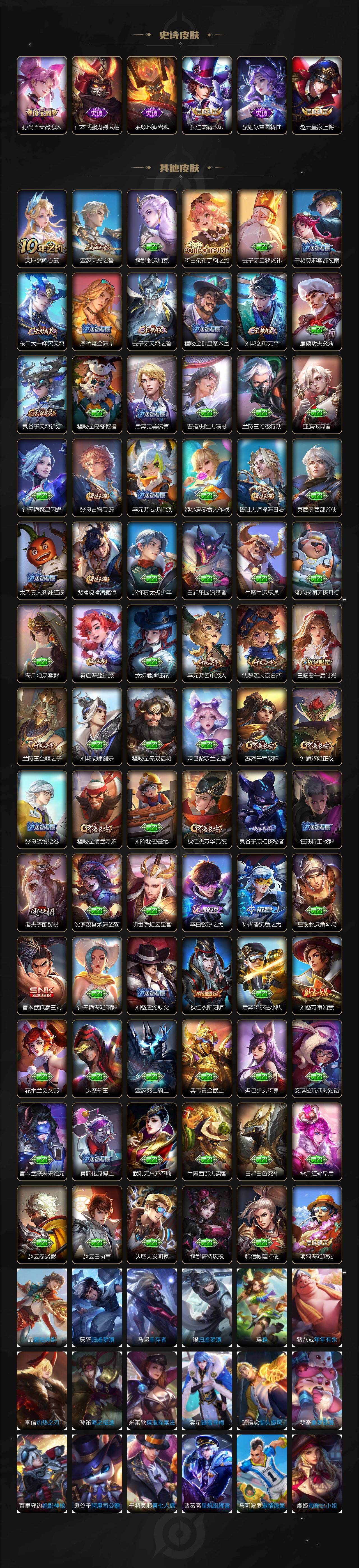 【限定皮肤】:姜子牙天穹之誓,狄仁杰阴阳师,赵云皇家上将,孙尚香蔷薇恋人,元歌