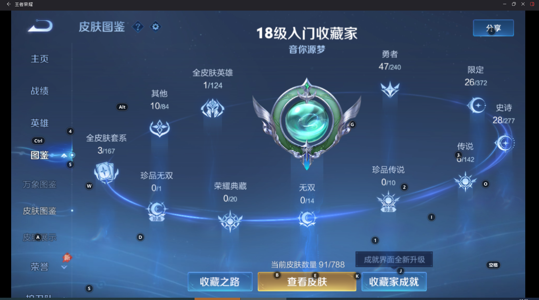 愿照+逐花澜!皮肤数量91印记总数5V5尊贵铂金可修改账号类