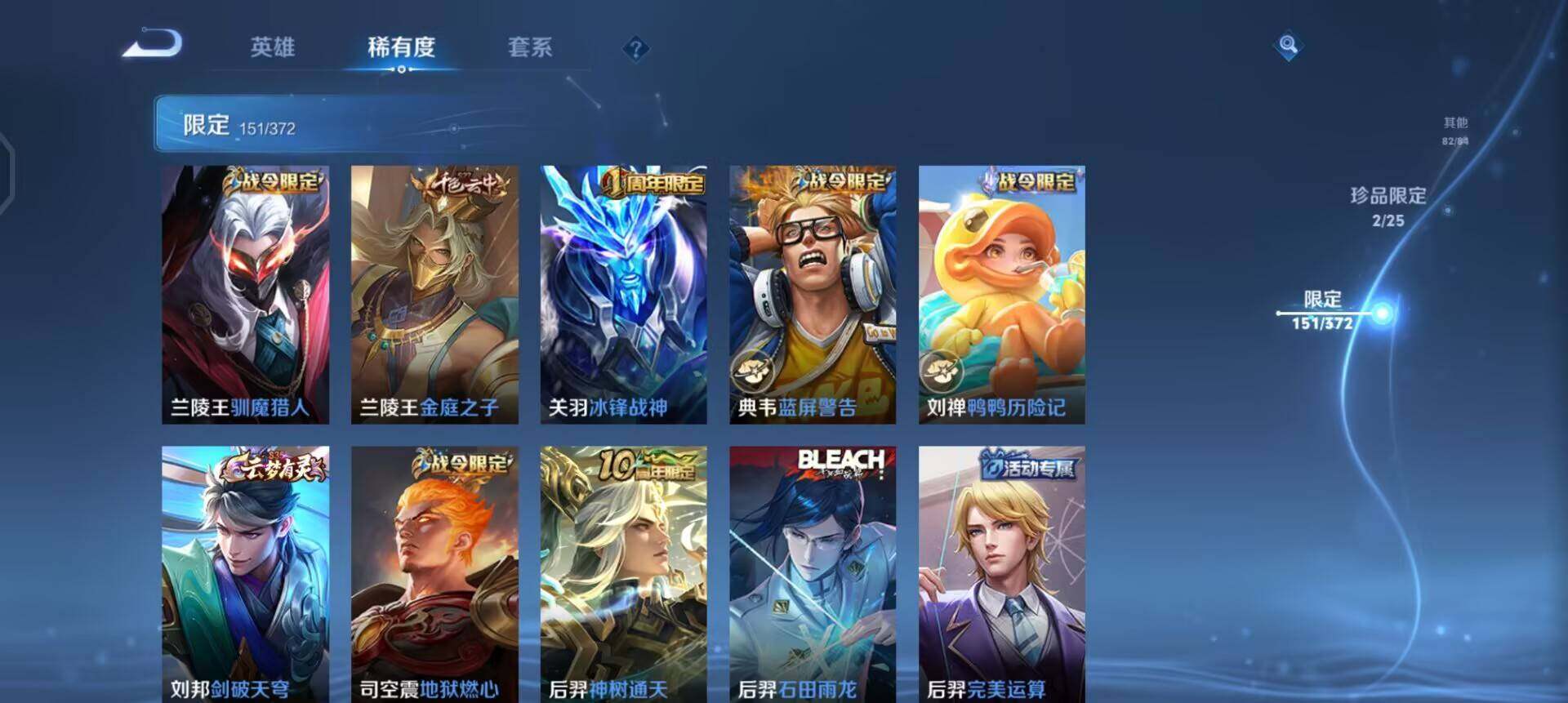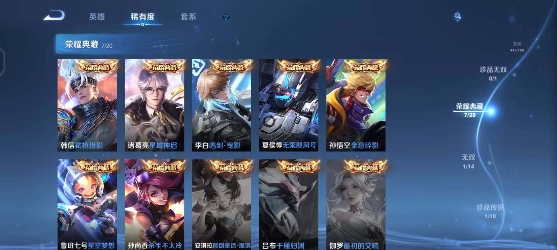 V10-至尊星耀IV段位-129英雄-446皮肤-7典藏皮肤-1无双-1珍品传说-38传说-131史诗