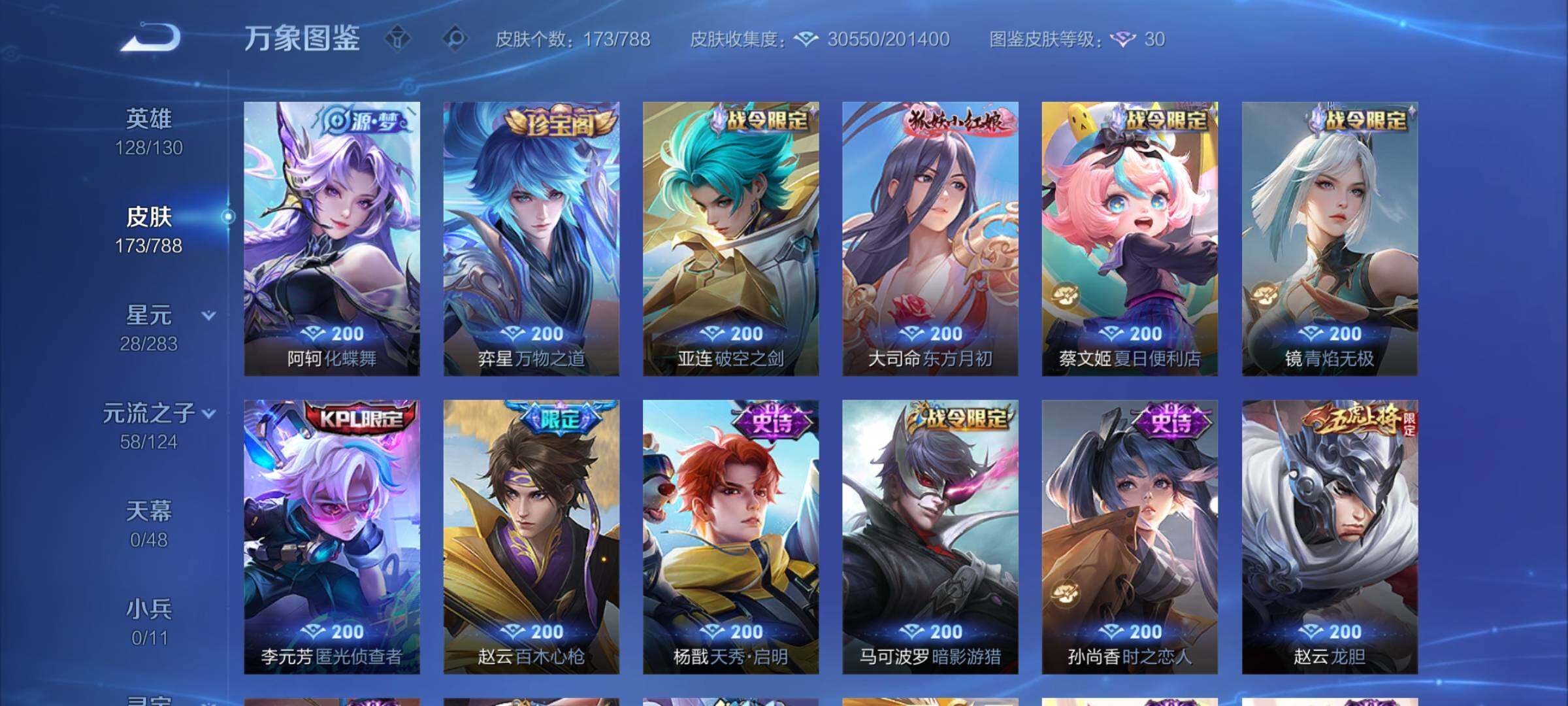 128英雄-173皮肤-6王者印记-90铭文-贵族积分3w