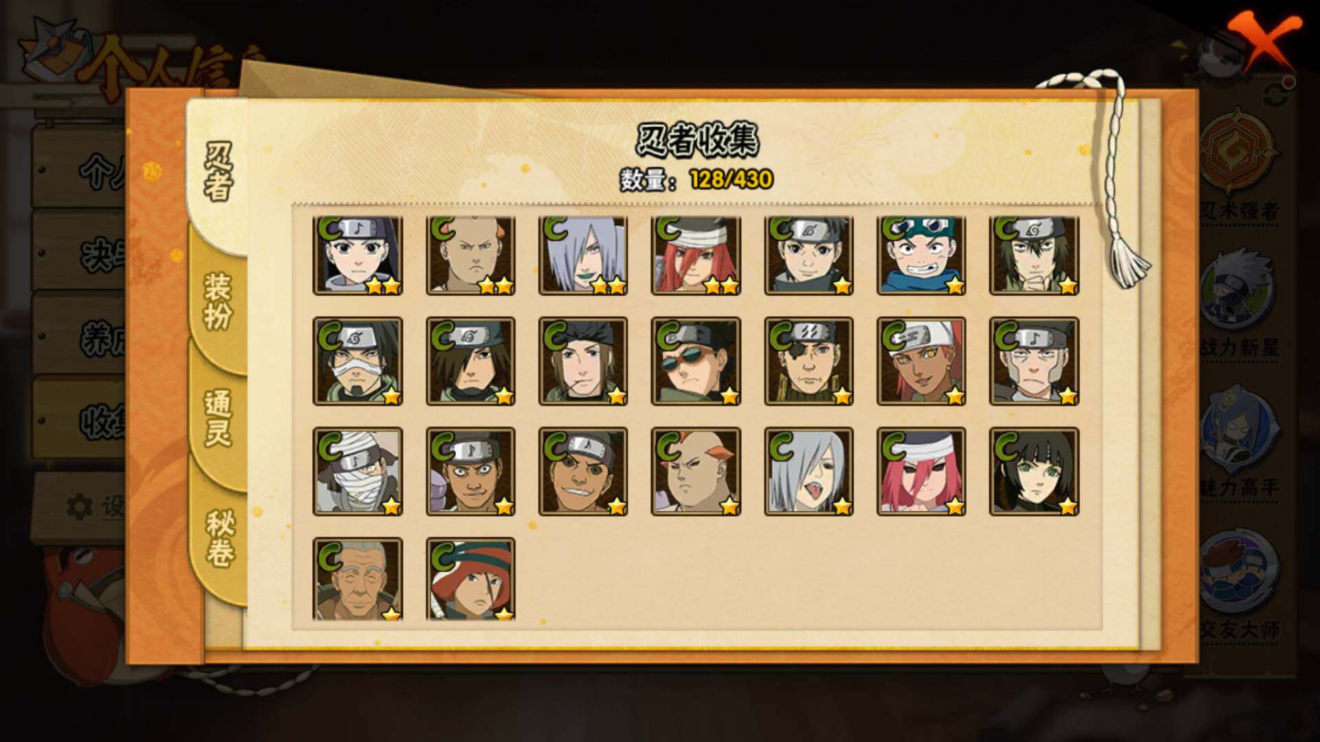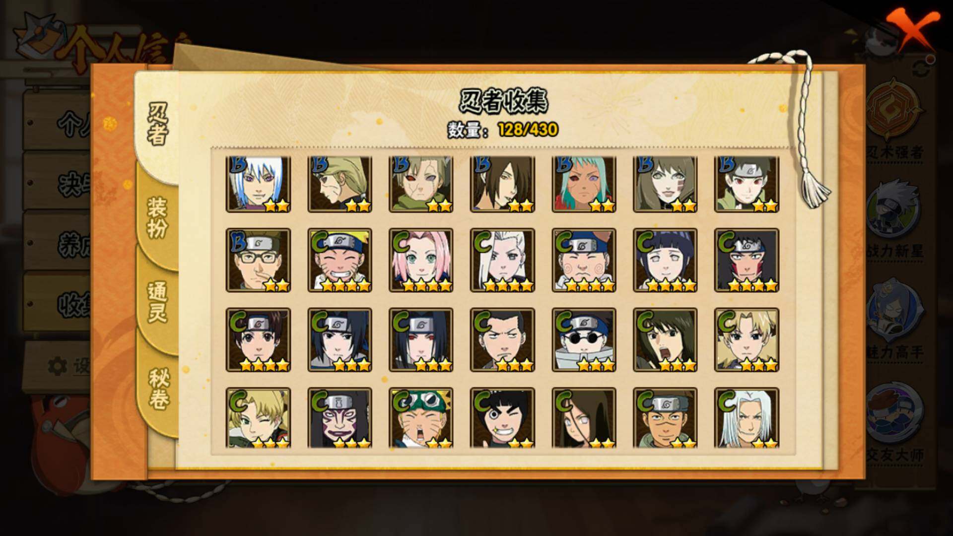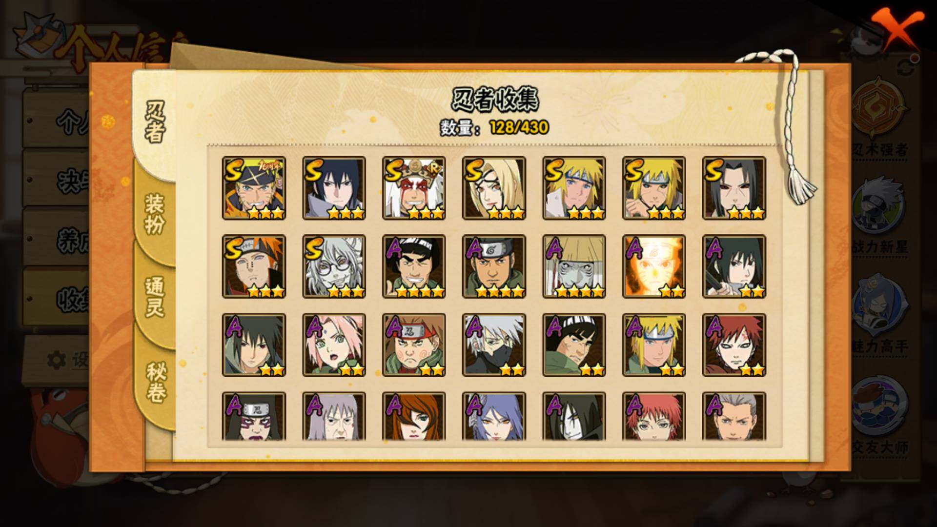 【S级忍者】:波风水门「秽土转生」(3星),宇智波鼬「秽土转生」(3星),自来也「舞之豪杰」(3星),纲手「百豪」(3星),波风水门(3星),药师兜「仙人模式」(3星),佩恩「天道」(3星),宇智波佐助「永恒万花筒」(3星),漩涡鸣人·宇智波佐助(3星)