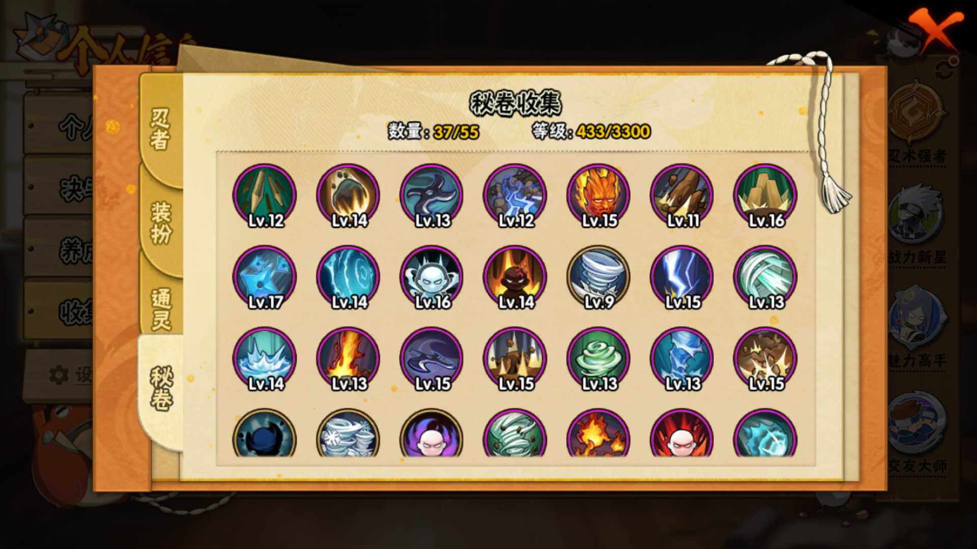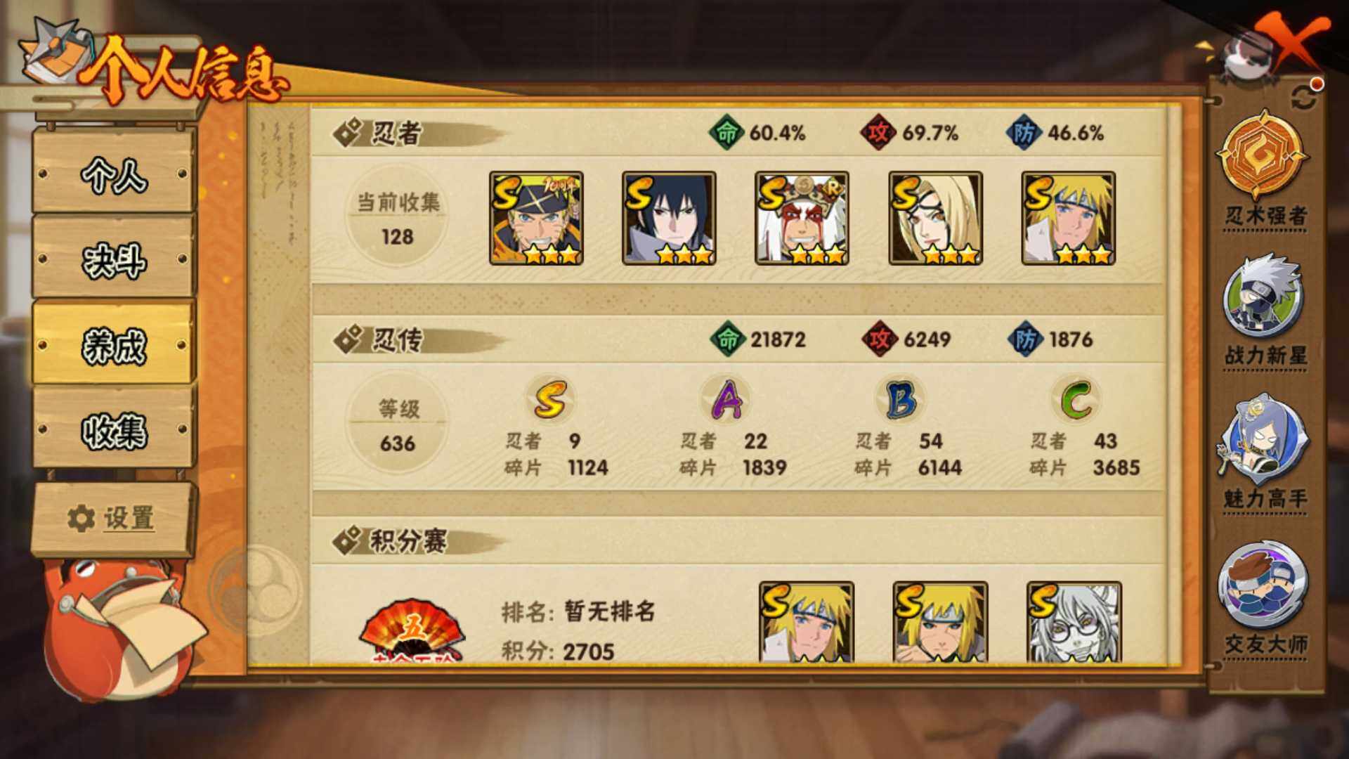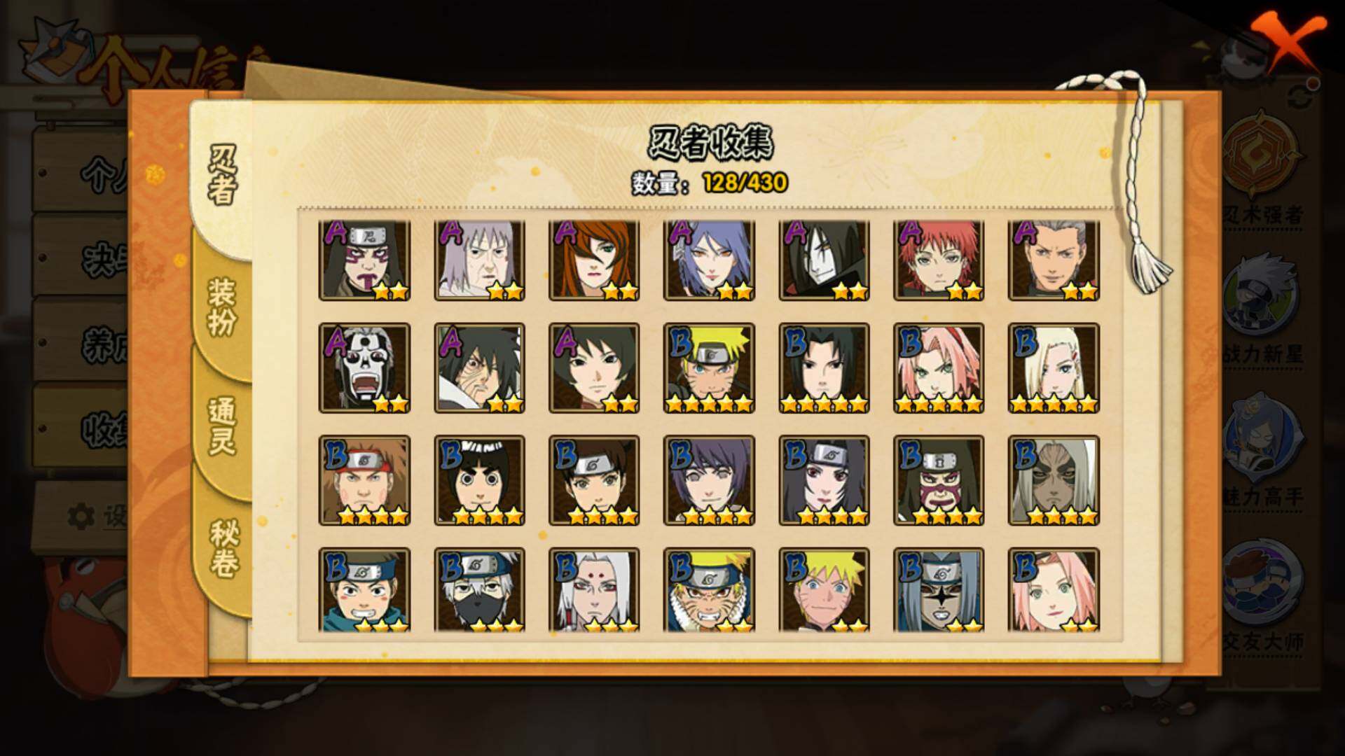 【S级忍者】:波风水门「秽土转生」(3星),宇智波鼬「秽土转生」(3星),自来也「舞之豪杰」(3星),纲手「百豪」(3星),波风水门(3星),药师兜「仙人模式」(3星),佩恩「天道」(3星),宇智波佐助「永恒万花筒」(3星),漩涡鸣人·宇智波佐助(3星)
