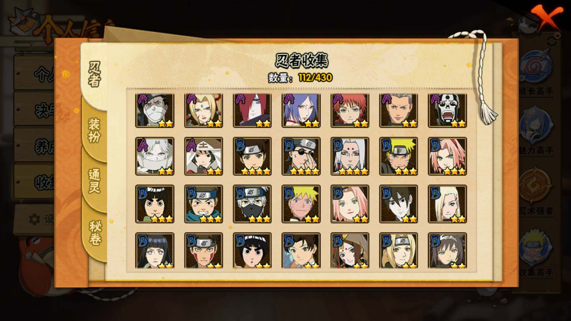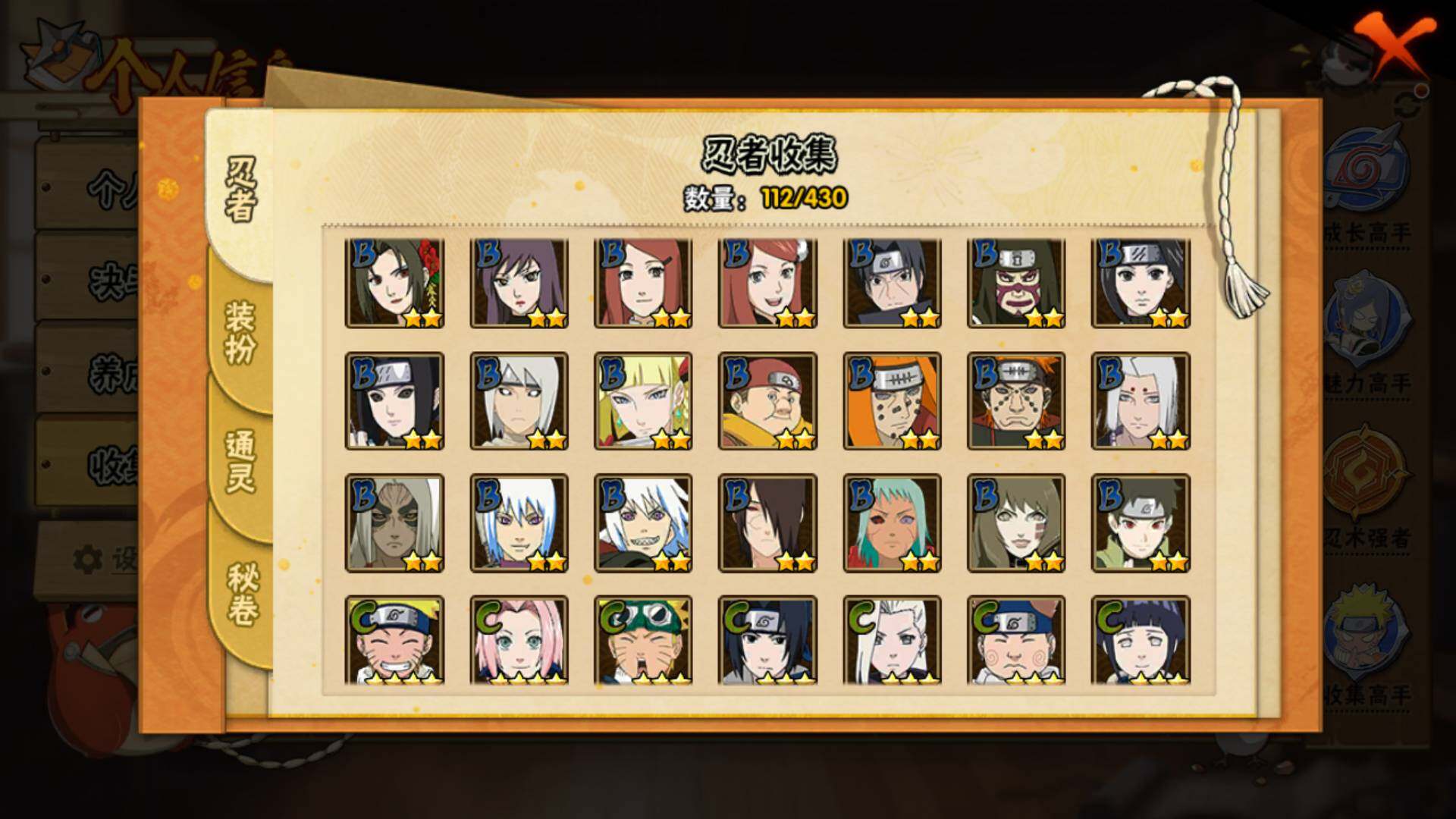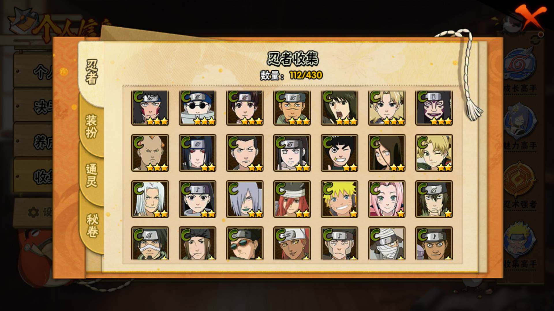 【S级忍者】:千手柱间「秽土转生」(3星),宇智波鼬「秽土转生」(3星),宇智波斑「秽土转生·解」(3星),春野樱「忍界大战」(3星),自来也「舞之豪杰」(3星),大蛇丸(3星),波风水门(3星),药师兜「仙人模式」(3星),佩恩「天道」(3星)