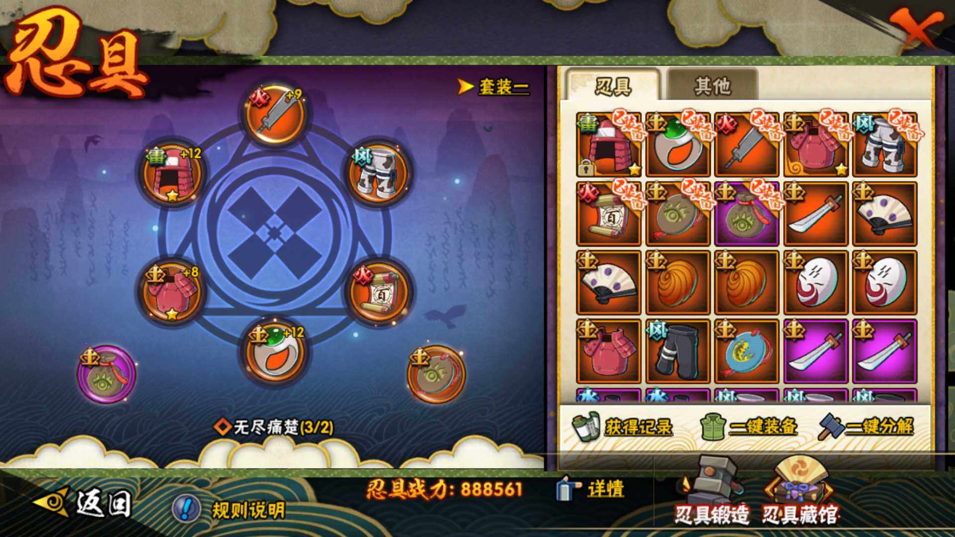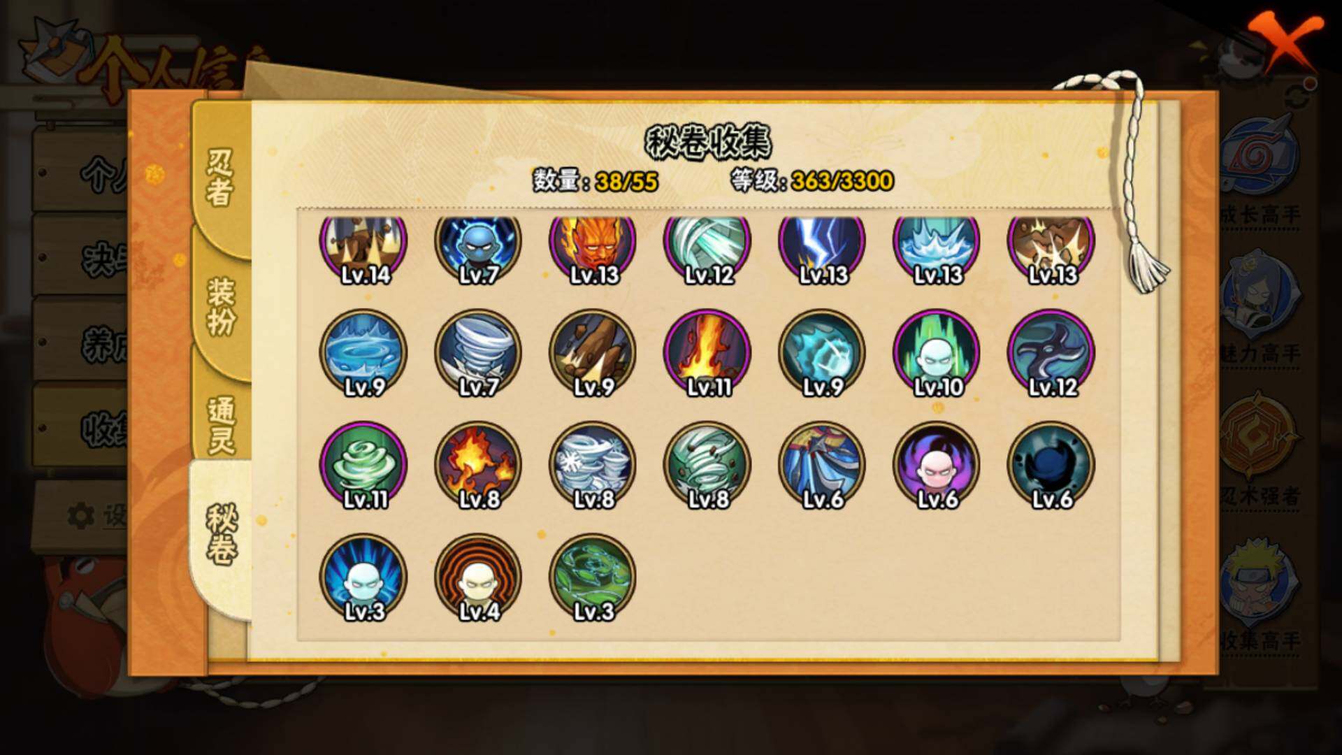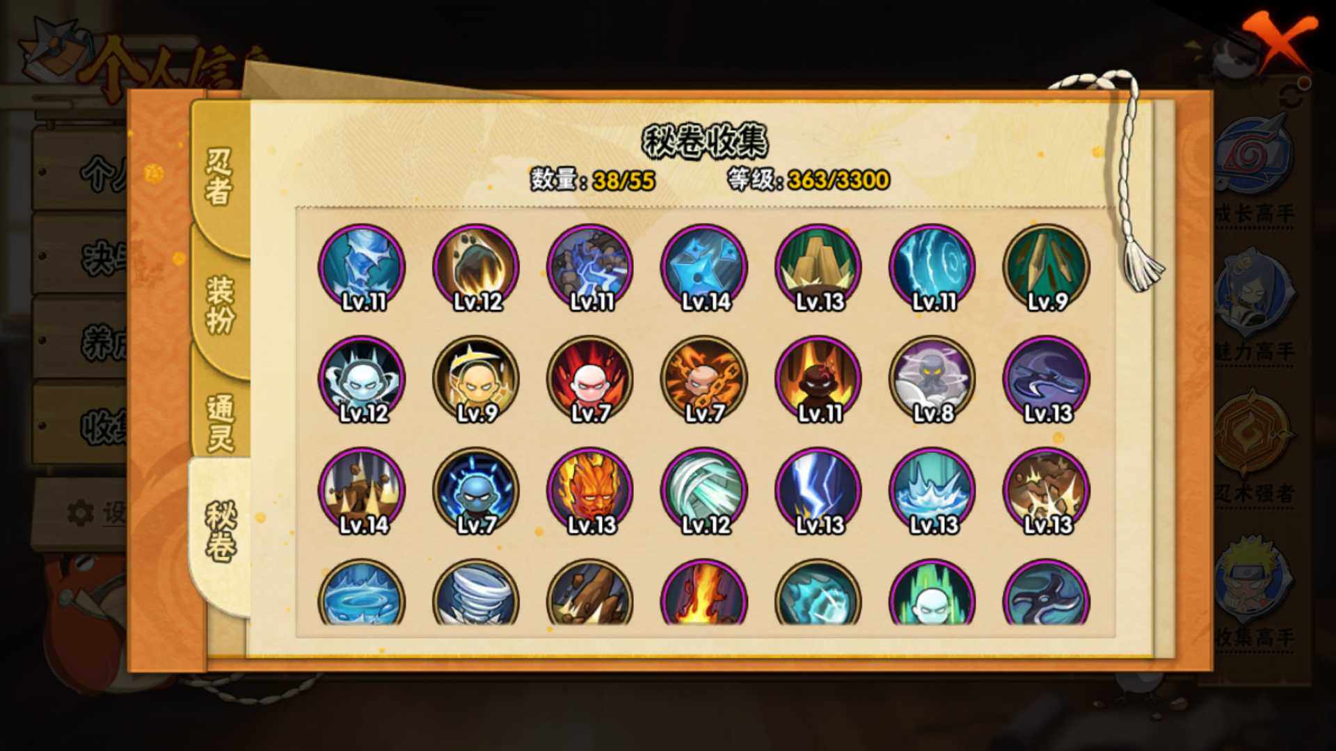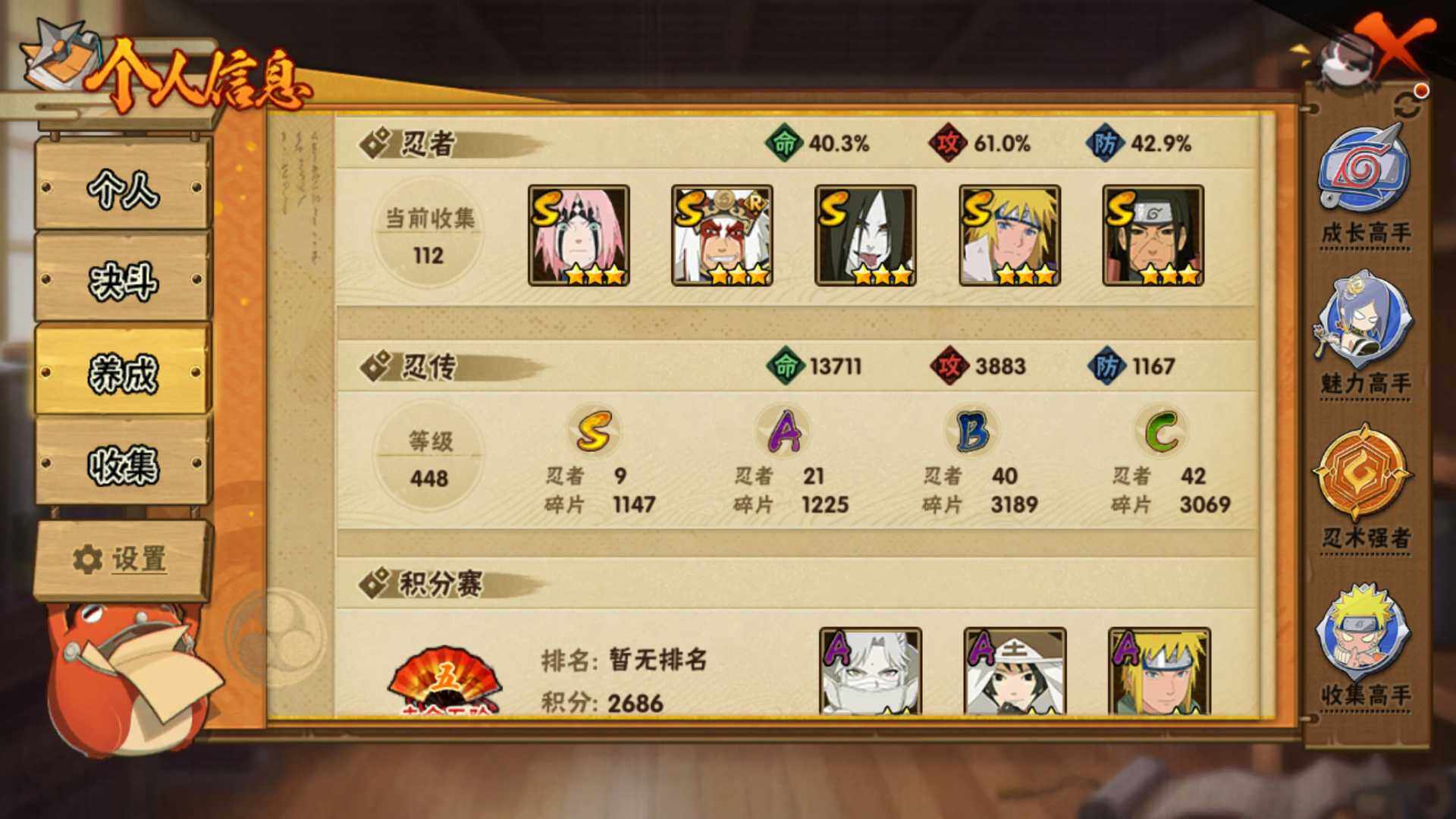 【S级忍者】:千手柱间「秽土转生」(3星),宇智波鼬「秽土转生」(3星),宇智波斑「秽土转生·解」(3星),春野樱「忍界大战」(3星),自来也「舞之豪杰」(3星),大蛇丸(3星),波风水门(3星),药师兜「仙人模式」(3星),佩恩「天道」(3星)