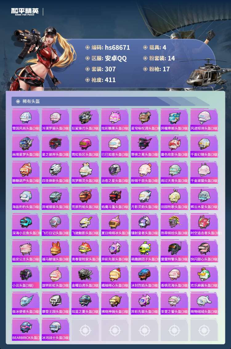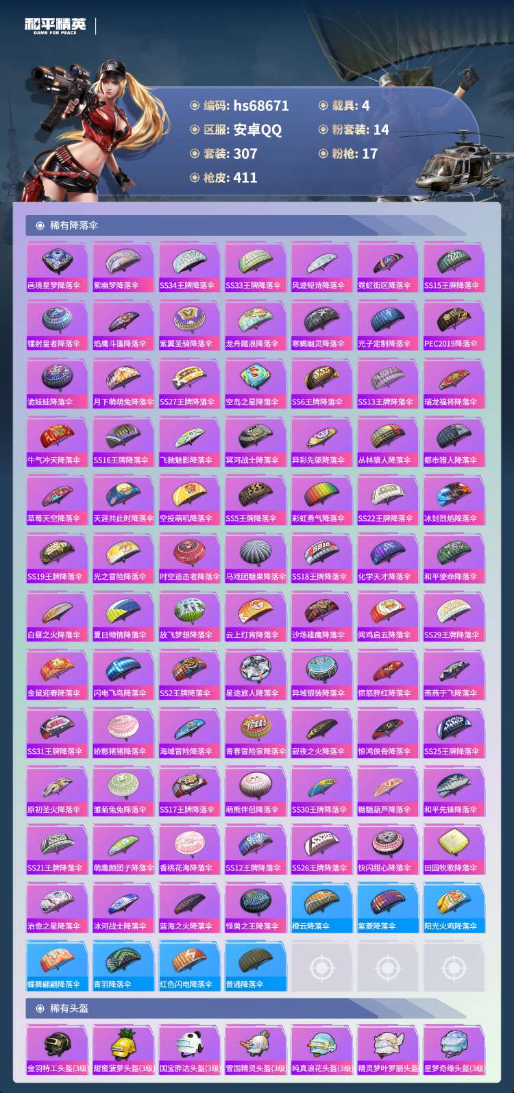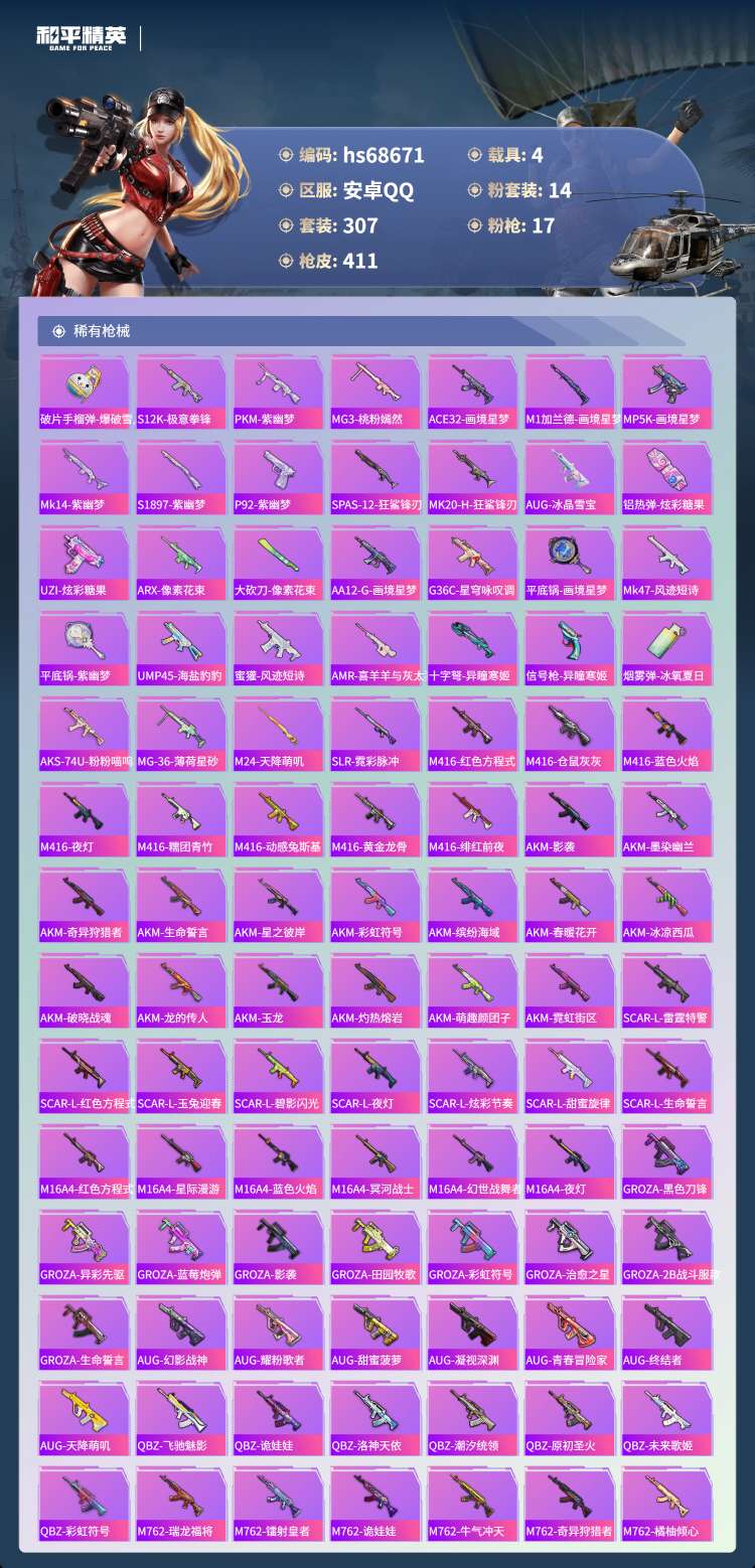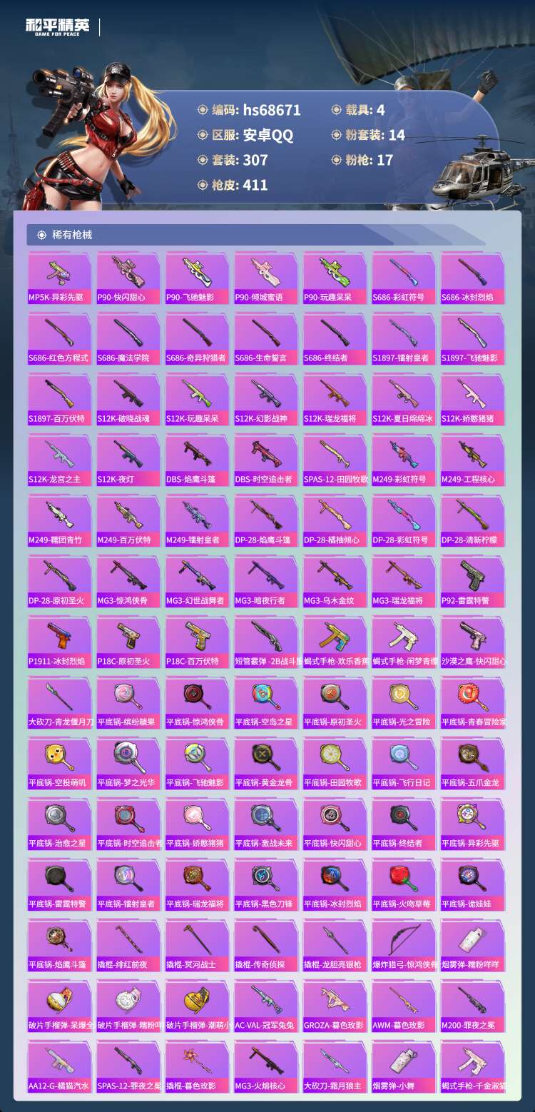 hs68671 安卓手Q-26王牌印记-有战神框-14粉装-17特效枪-4载具-135156热力值-