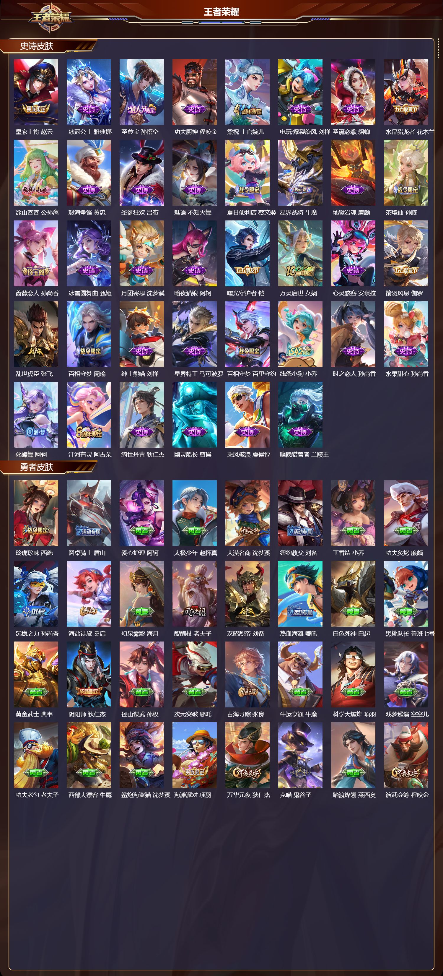 荣耀王者/310皮肤/128英雄/2典藏/0珍品无双/1无双/4珍品传说/22传说/79史诗/9稀有英雄