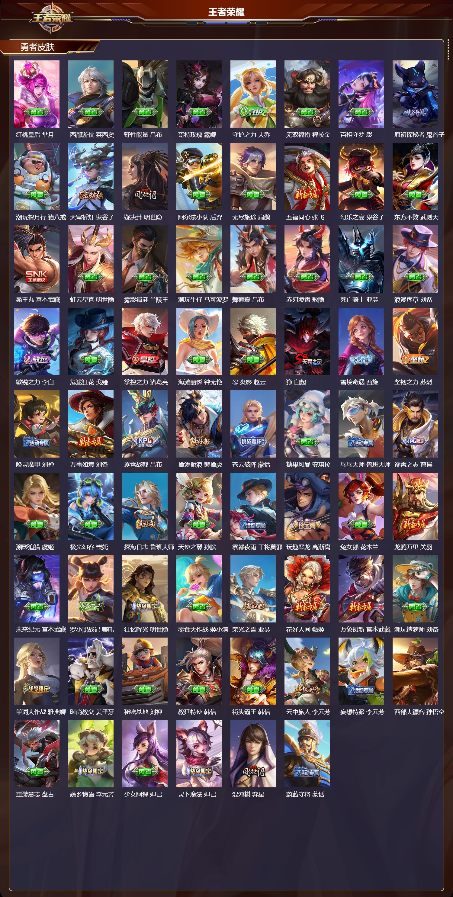 安卓QQ/荣耀王者/310皮肤/128英雄/2典藏/0珍品无双/1无双/4珍品传说/22传说/79史诗/9稀有英雄【4 珍品传说】大耳狗之梦 瑶,黑崎一护 宫本武藏,怪盗基德 马可波罗,江户川柯南 鲁班七号,【2 典藏皮肤】九霄神辉 花木兰,星域神启 诸葛亮,【1 无双皮肤】无相 孙悟空,【22 传说皮肤】启明星使 虞姬,逐花归海 澜,无双飞将 马超,九山相柳 司马懿,地狱火 孙悟空,云鹰飞将 曜