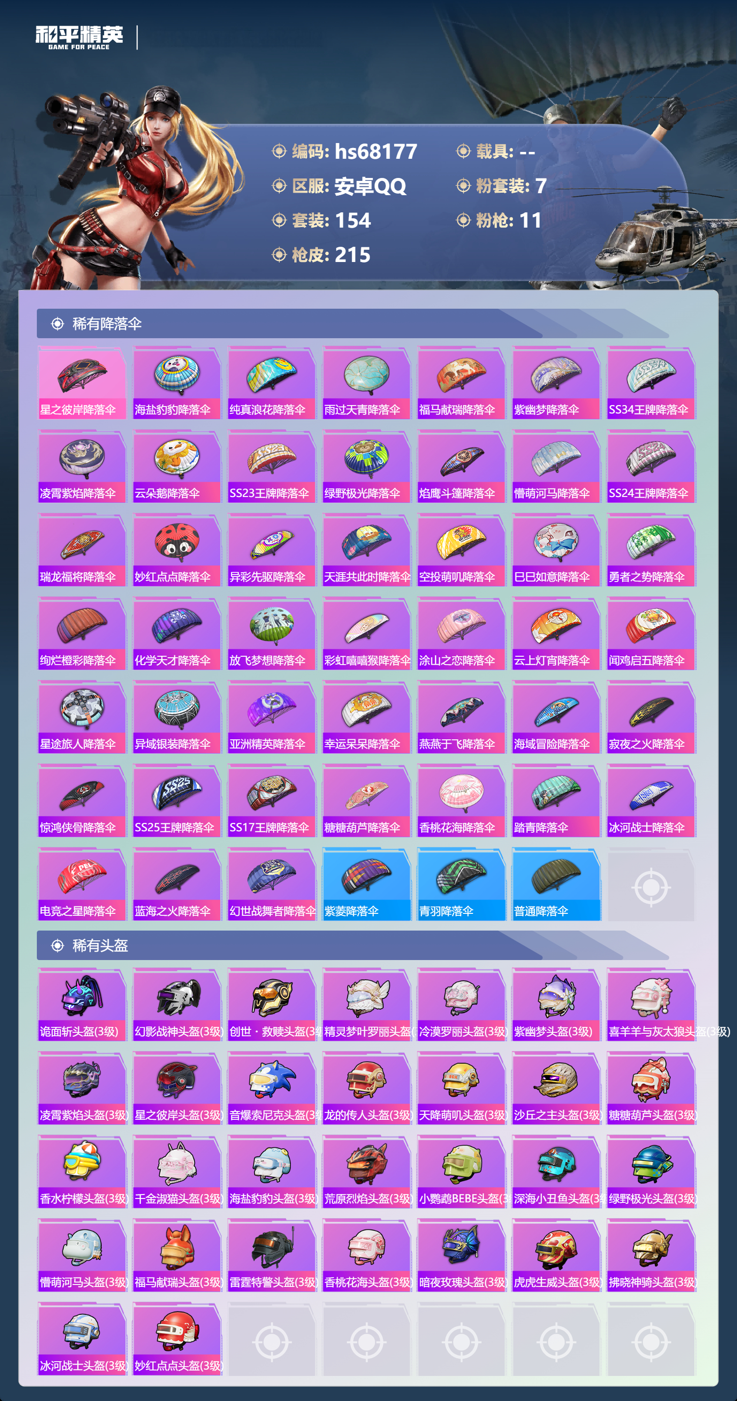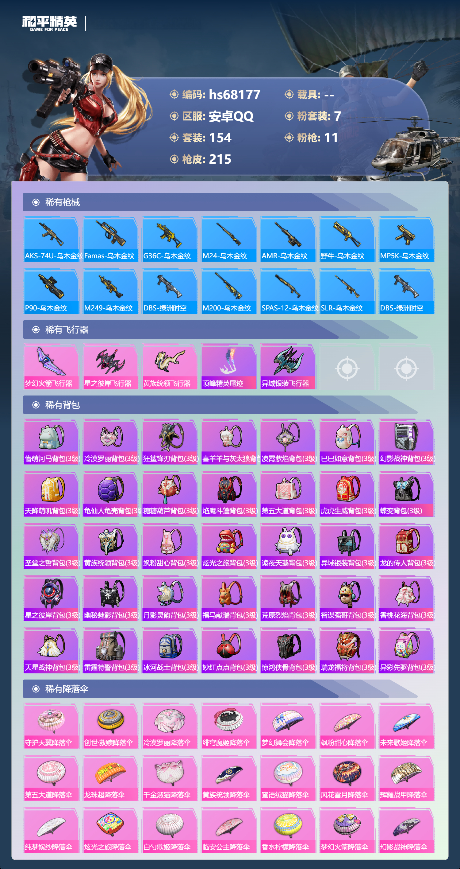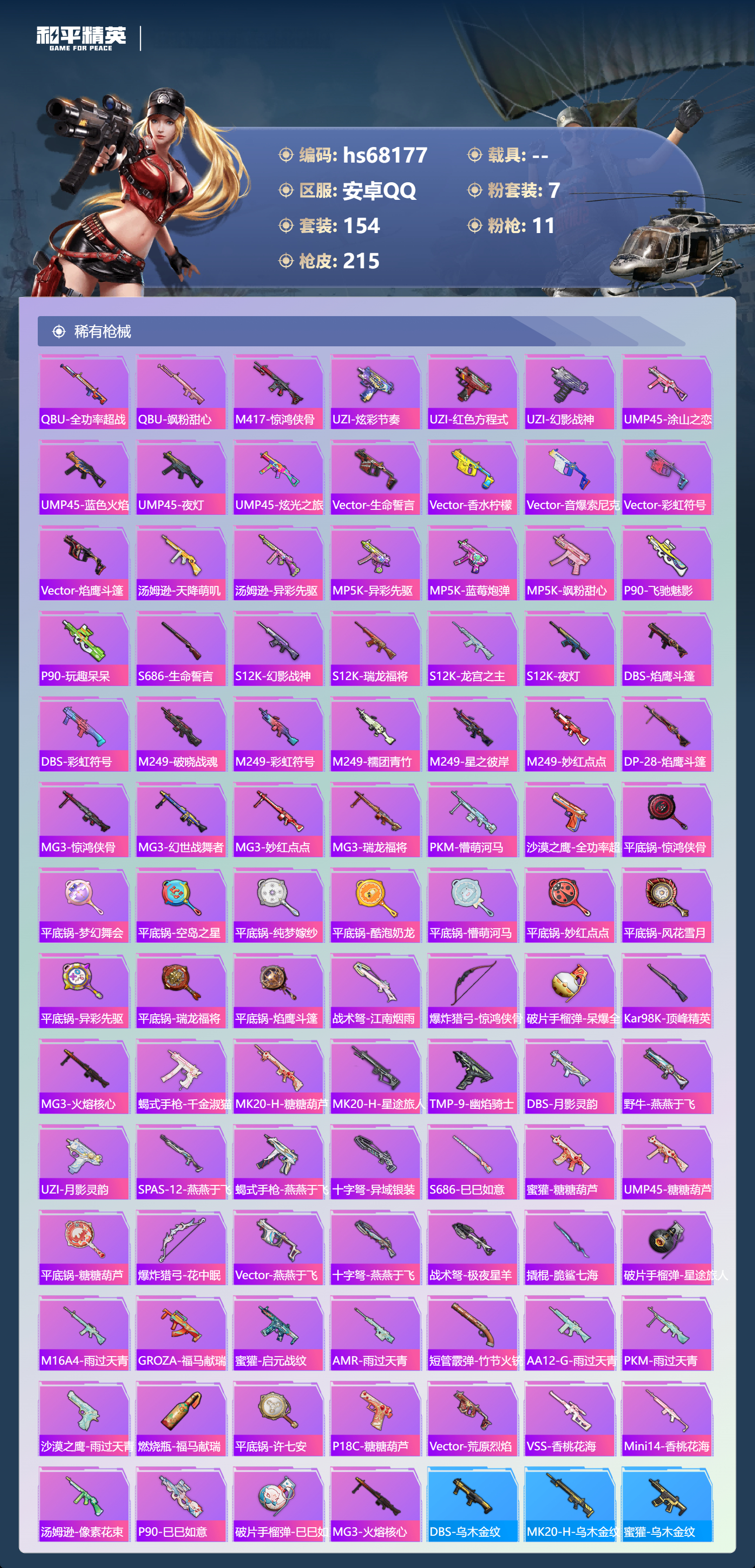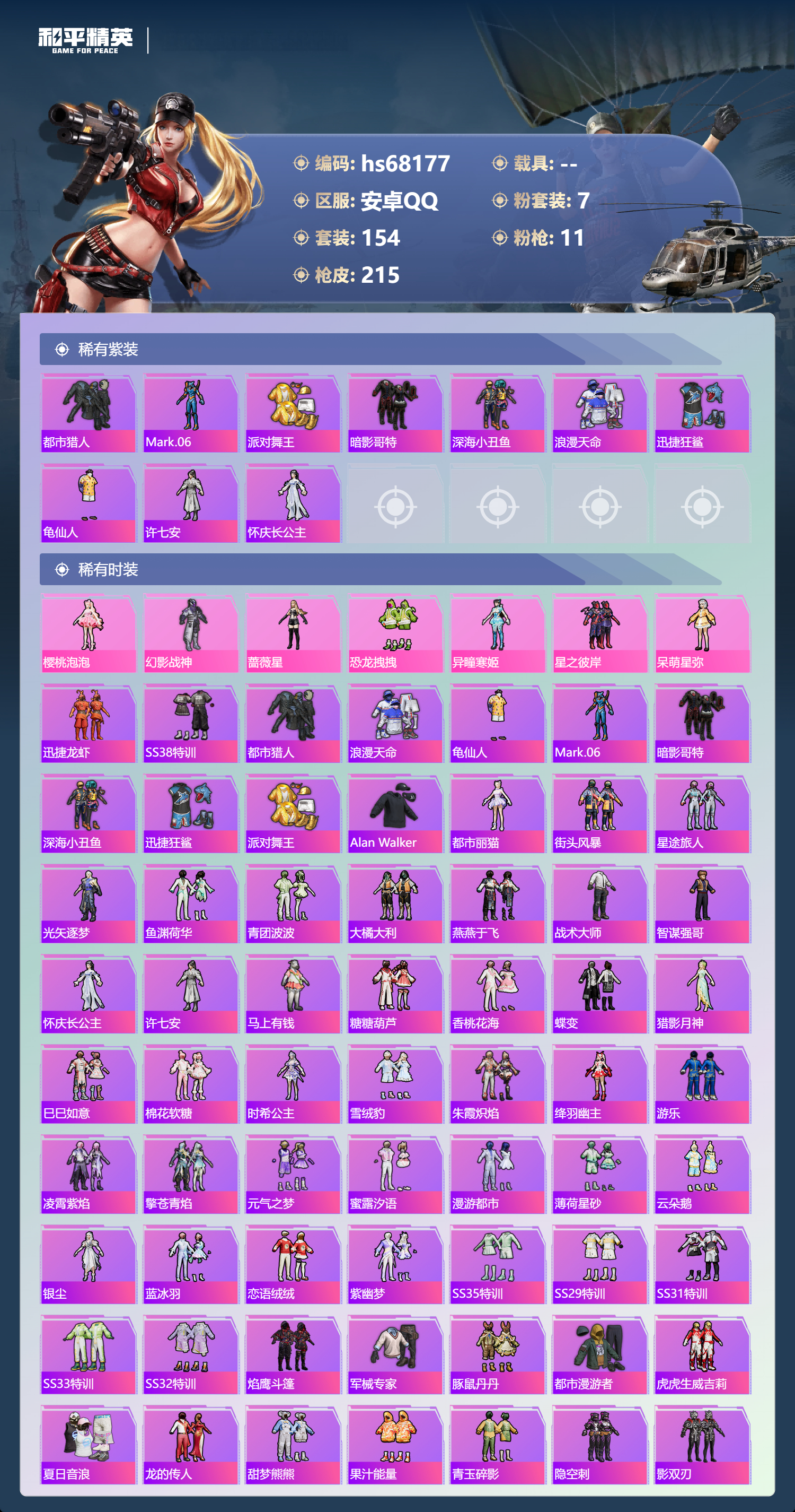 hs68177 安卓手Q-7王牌印记-7粉装-11特效枪-67136热力值-154套装-215枪皮-1卓越印记-1传奇印记