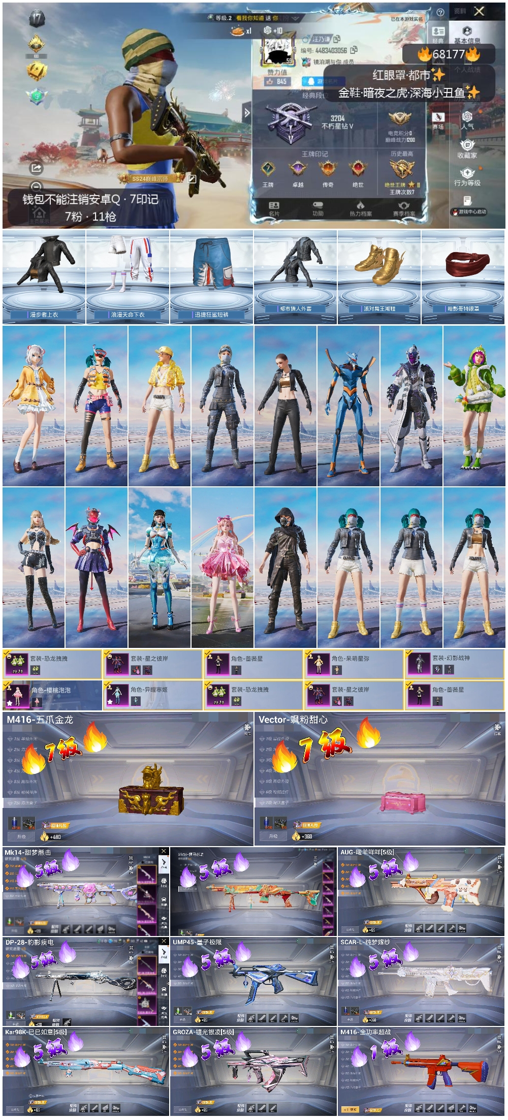 【11特效枪】UMP45-量子极限/5级,M416-全功率超战/1级,M416-五爪金龙/7级,SCAR-L-纯梦嫁纱/5级,Mk14-福马献瑞/5级,GROZA-镜光银凌/5级,Vector-飒粉甜心/7级,Kar98K-巳巳如意/5级,DP-28-豹影