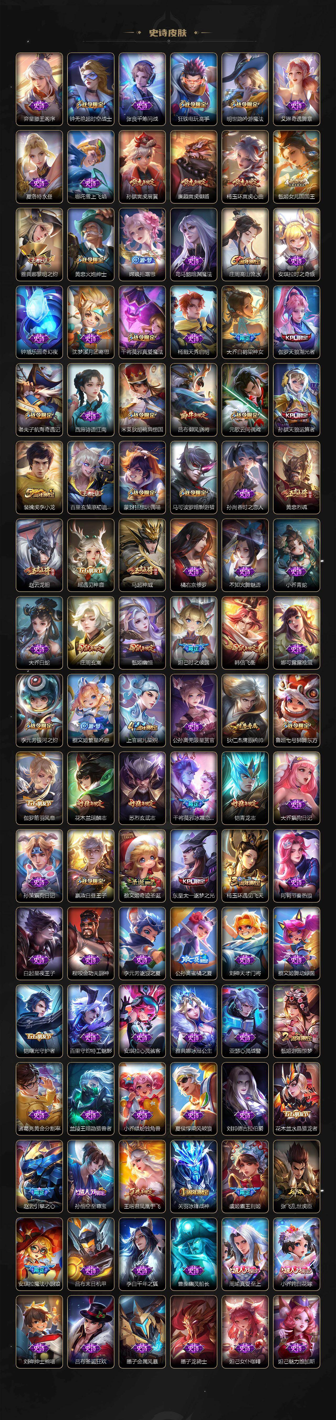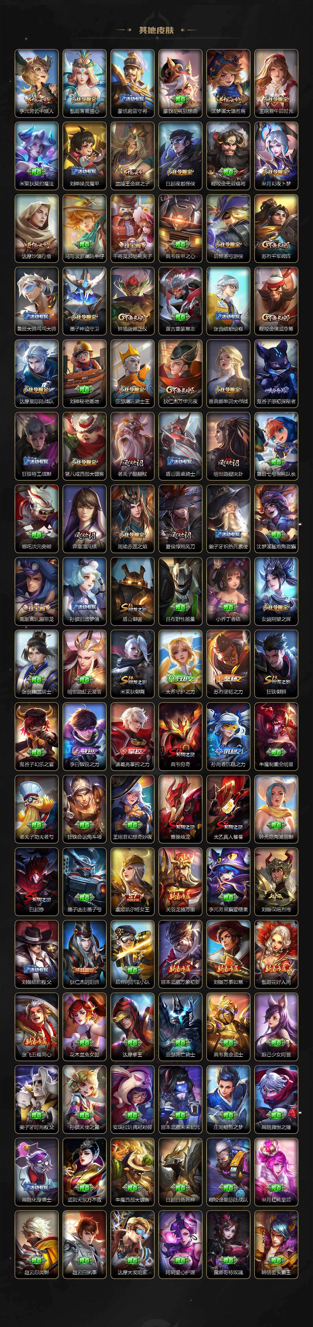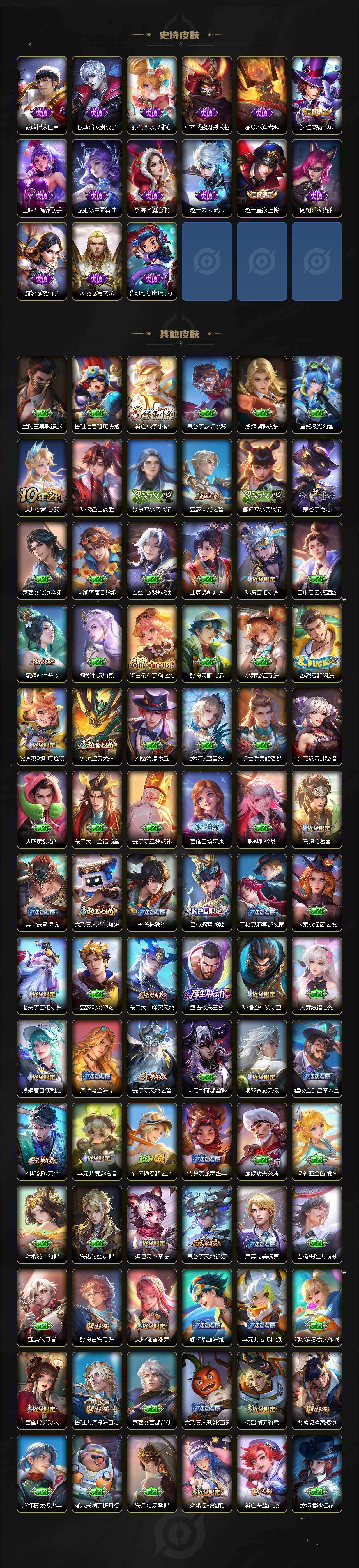 【限定皮肤】:姜子牙天穹之誓,狄仁杰阴阳师,赵云皇家上将,孙尚香蔷薇恋人,元歌无心,达摩沙漠行僧,项羽