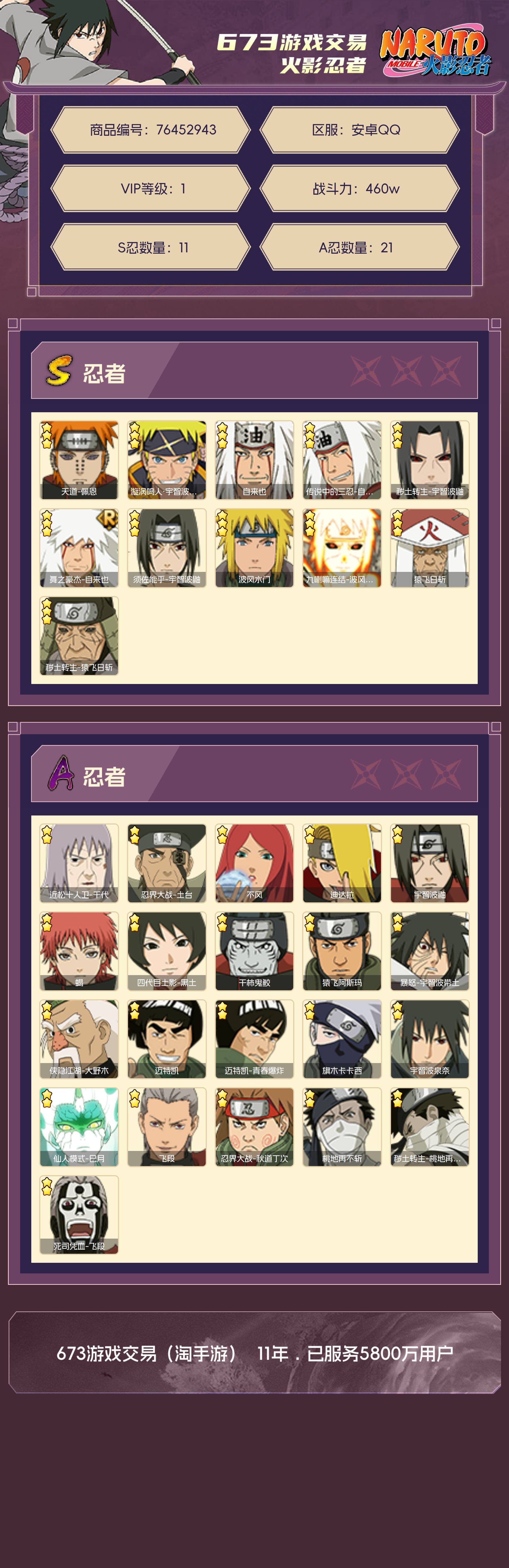角色等级134 金币4080 战斗力460w S忍11 A忍21 1 段位中忍