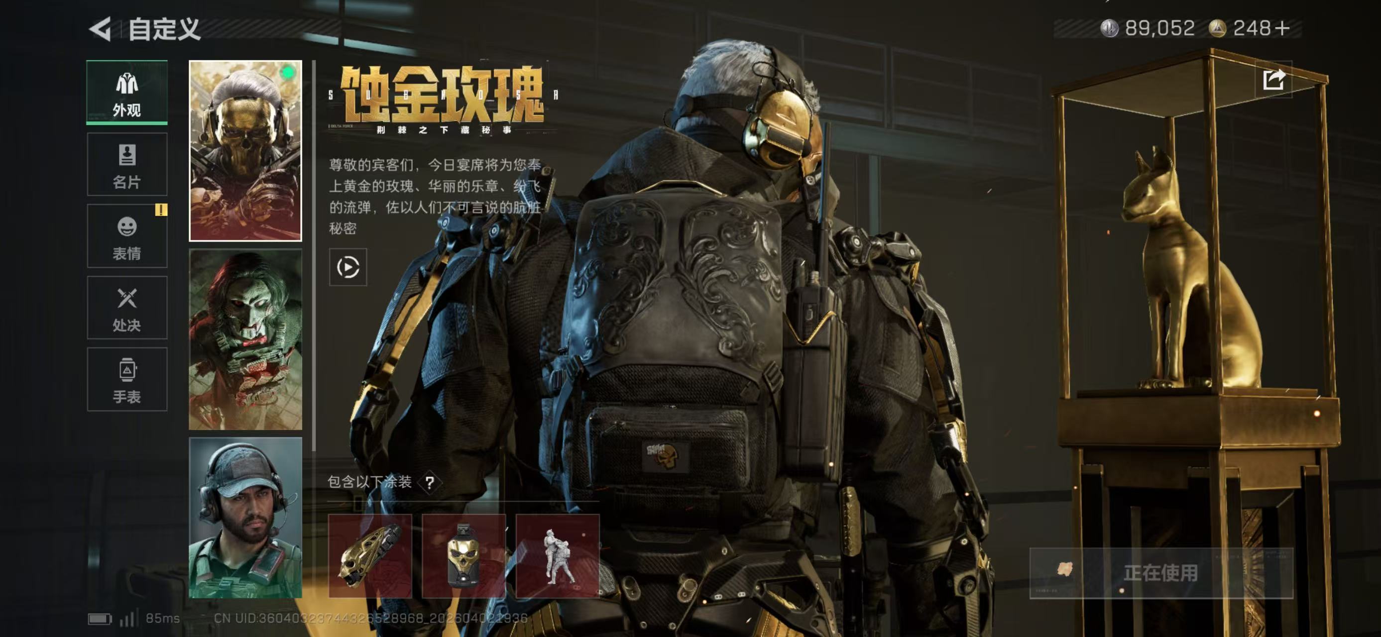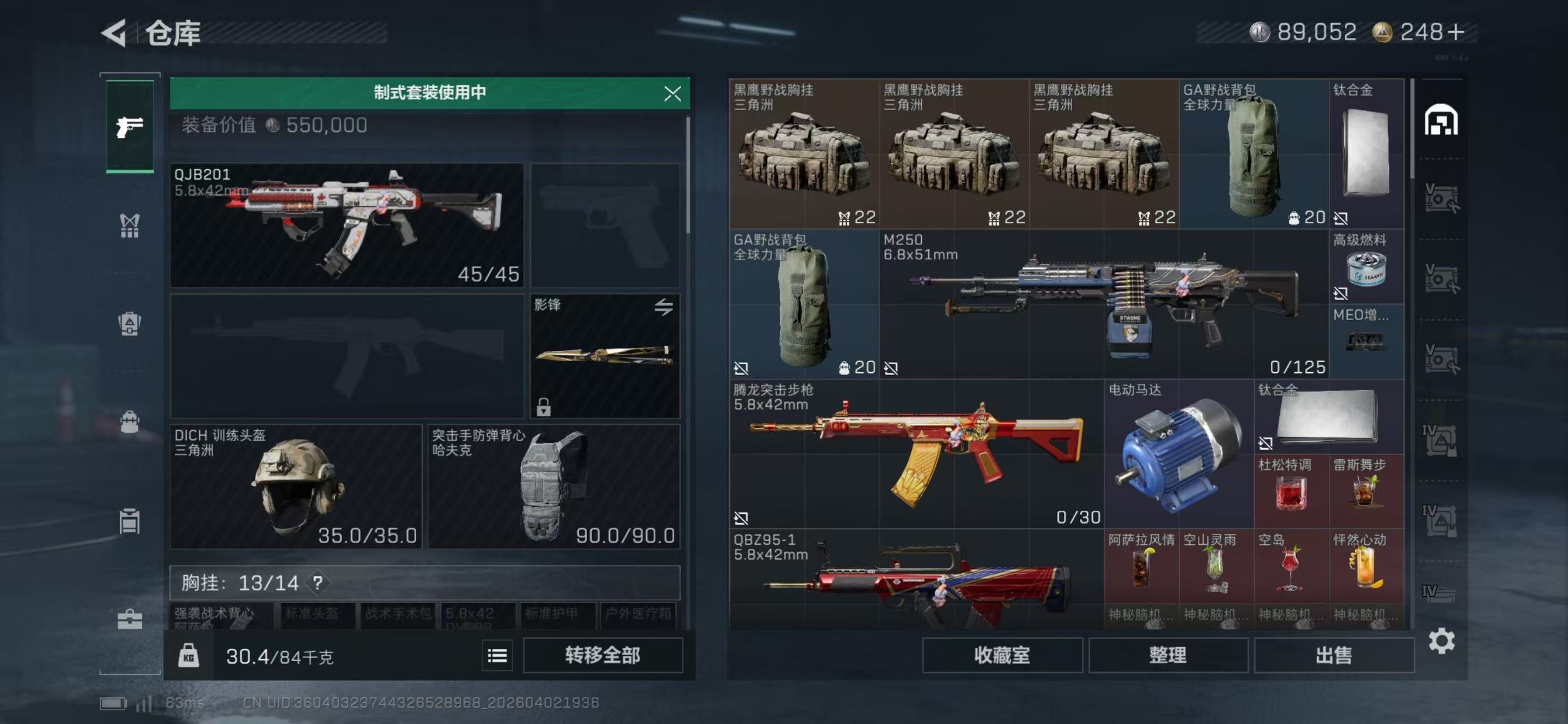 总资产210.86M,哈夫币 89.05K,战场等级:50 上等兵,行动等级:60 钻石,角色皮肤8,枪皮数量238【特战干员外观】红狼-蚀金玫瑰,骇爪-维什戴尔,牧羊人-街头之王,蜂医-送葬人·无题密令,无名-夜鹰,红狼-电锯惊魂,露娜-金牌射手,深蓝-不破誓约,【近战】近战-影锋,近战-黑鹰,【典藏外观】Vector冲锋枪-美杜莎(优品C),M7战斗步枪-棱镜攻势S2(优品S),AWM狙击步枪