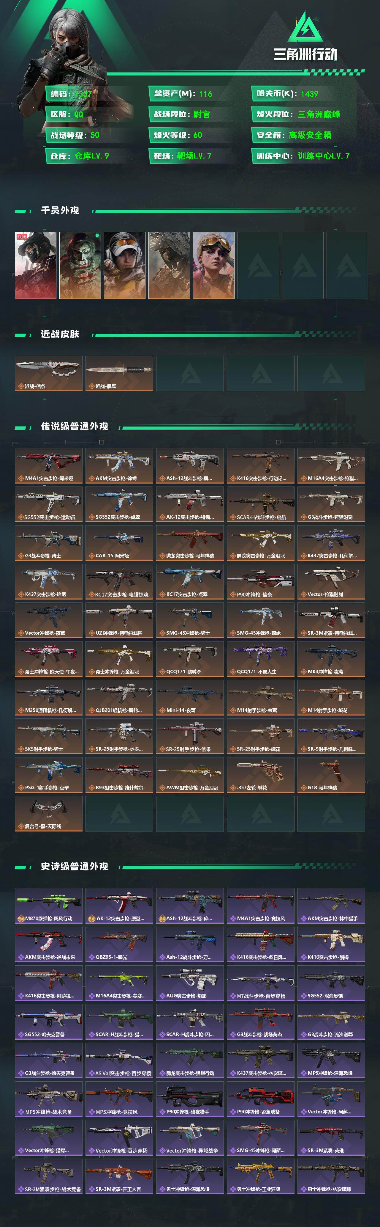 总资产116M/哈夫币143万/传说近战数1/传说枪皮数46/战场等级50/行动等级60/安全箱等时效性道具以游戏内数据为准,详情请看图/露娜-黑·天际线/红狼-电锯惊魂/露娜-金牌射手/乌鲁鲁-荒原猎手/蛊-不羁人生/近战-信条/近战-黑鹰/M4A1突击步枪-阿米娅/AKM突击步枪-锦绣/ASh-12战斗步枪-鹅鸭杀/K416突击步枪-行动记录/M16A4突击步枪-狩猎时刻/SG552突击步
