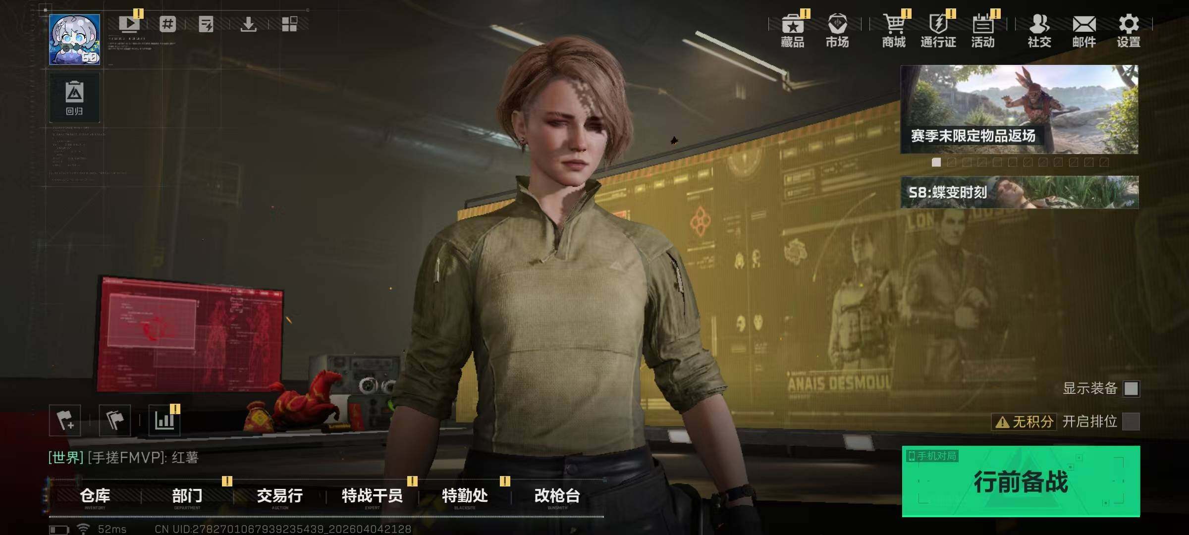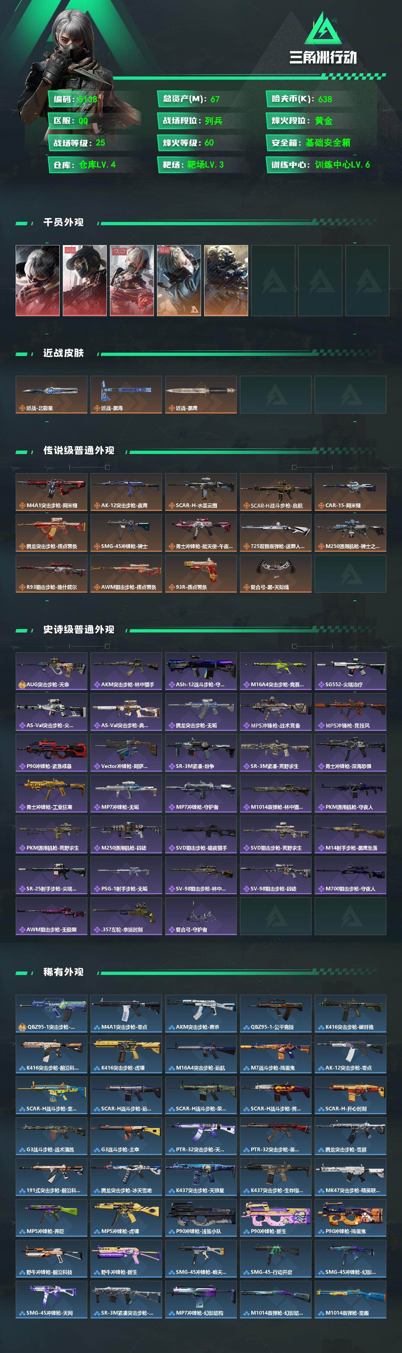 67m总资产-638k哈夫币-60烽火等级-黄金-25战场等级-列兵【干员外