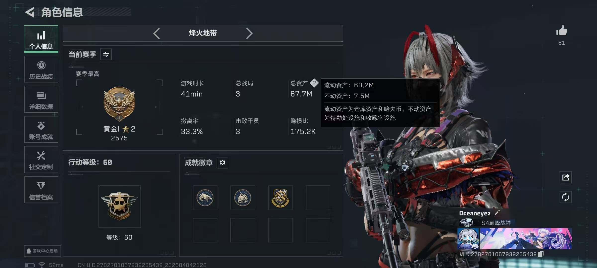 67m总资产-638k哈夫币-60烽火等级-黄金-25战场等级-列兵