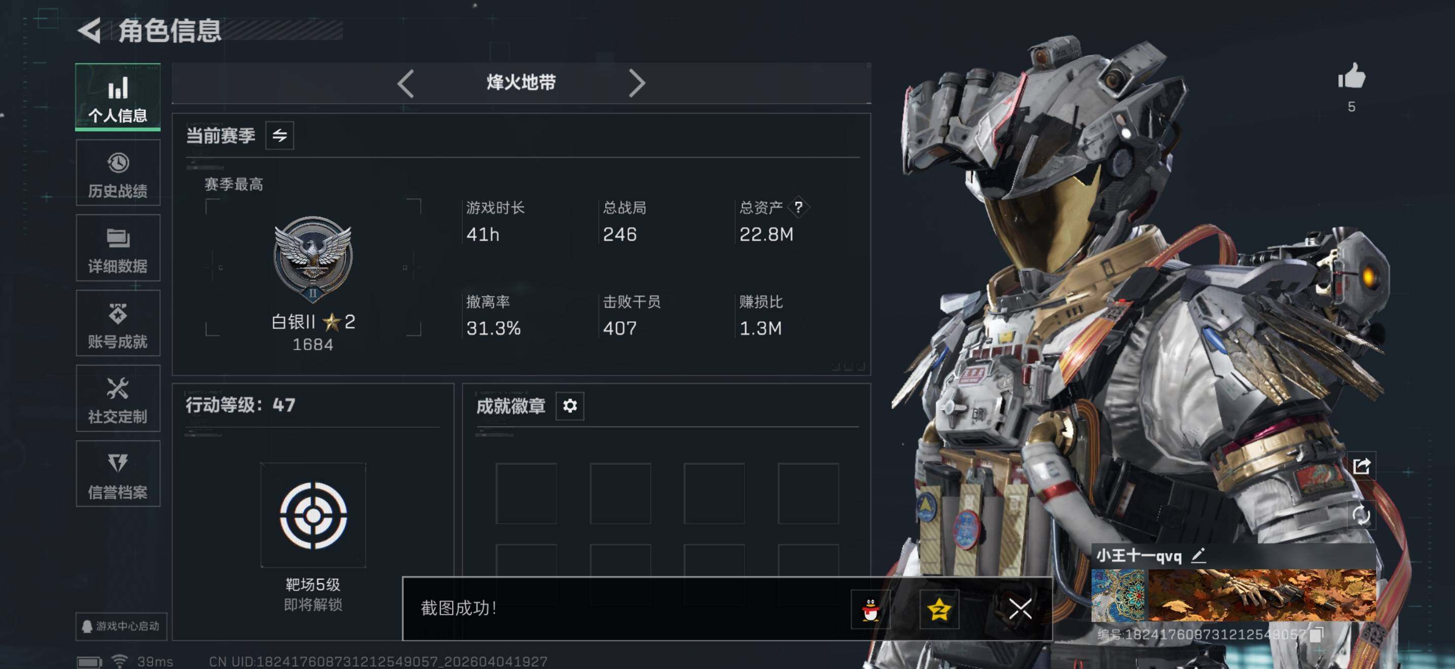 22m总资产-1841k哈夫币-47烽火等级-白银-1战场等级-无军衔【干员